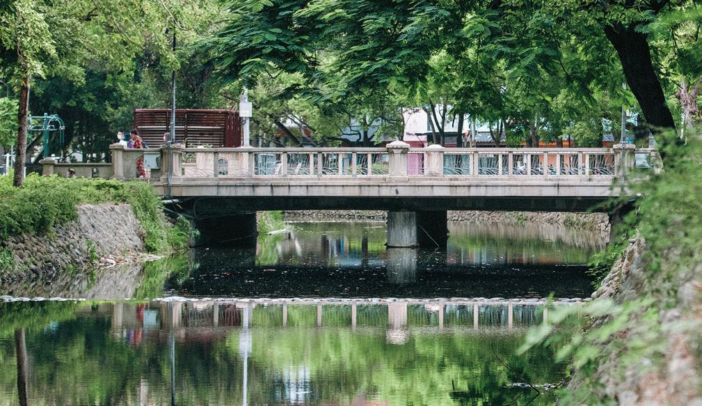 步行城市,但在這之前,他們已經花了更大的資 源,先把上游的水變乾凈。」隆恩圳的南北向圳 身因穿越民權路、民生路而截成三段,以往各段 被擁擠的雜林及不鏽鋼高欄阻斷視野,改以低矮 的水草欄杆取代,與綠帶地景地物自然融合,高