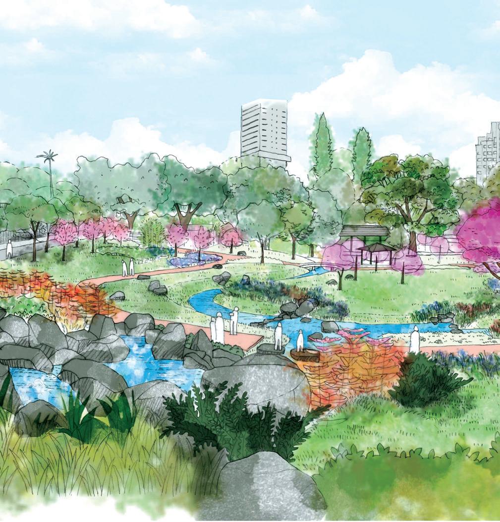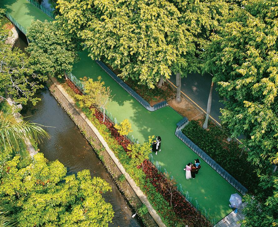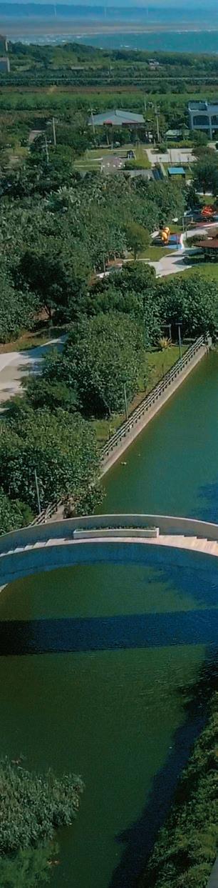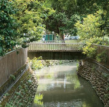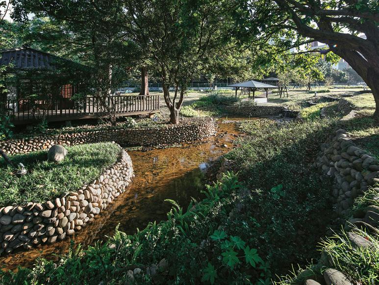 蜒小徑;擁有300年歷史的隆恩圳,也在設計團 隊利用圳道沿岸老樹群,分段設計高架綠地、樹