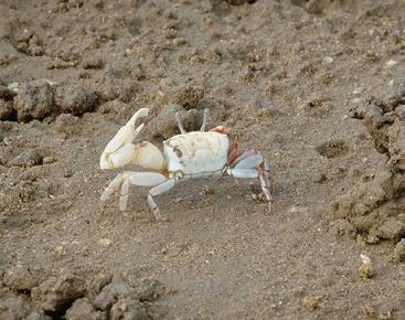137 SCENE III 微笑水岸 讓地、讓道、克己與共享 a.漲潮時無法賞蟹但可觀鳥。圖為濕地上的普遍留鳥小白鷺。b.步 道適度區隔了人為干擾與濕地環境,蟹蟹大軍得以安心出沒。圖 為濕地常見的清白招潮蟹。c.香山濕地是介於河口與海岸線之間 沖積而成的潮間帶。 ( a-c.皆取自宏觀視野紀錄片 ) c