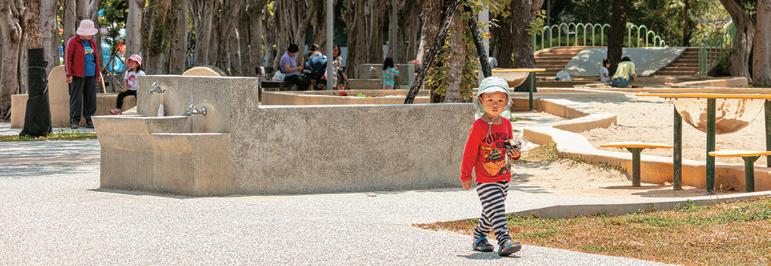 026 新竹夢想之地HSINCHU CITY, THE WONDERFUL LAND d f e d.一整面寬大的磨石子溜滑梯,常讓小朋友玩到不想回 家。e. 城市綠地為親子增添幸福日常。( d-e.楊智仁攝 ) f.隆恩圳剖面圖。 ( 田中央聯合建築師事務所提供 )