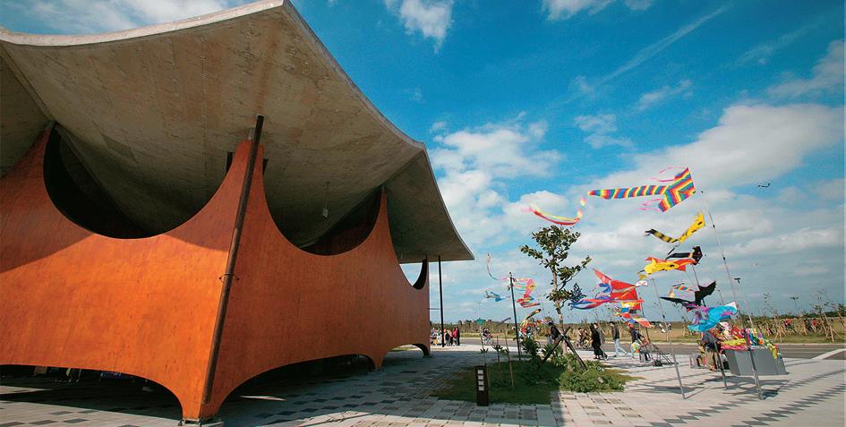 151 SCENE III 微笑水岸 讓地、讓道、克己與共享 因此改造計畫未新建任何建築,而以調整原有 建築配置、更新設施,配合遊客需求,改變原 建築機能等設計方式,提升港區觀光休閒及漁 業設備品質。若干景觀設施與建物因未達法令 拆除年限無法拆除或是使用率偏低,團隊拿來 改造,二次運用,改以移位、外觀改善、周邊 配置調整等方法,予以保留再利用,以降低工 程碳足跡、減少廢棄物。 既有柏油鋪面停車場占地四公頃,平日使用率 低,於是調整停車位及車道,配置增加植栽,提 高停車場綠覆面積,提升景觀綠美化效益;既 有的南寮旅遊服務中心前方的硬鋪面大廣場改 設兒童戲水沙灘和遊憩區,吸引親子遊客造訪; 港區廢棄的消波塊用來填土,打造拋石護岸, 發揮改變地形、調整微氣候,防風、防砂功能, 有些原本要報廢的建材也用來創作超大型海洋 石雕水景,鰻魚石雕、章魚石雕、螃蟹石雕、 烏龜石雕等等,可愛吸睛。 入秋之後特別強勁的九降風,使南寮地區成為 國內外風箏競技的絕佳場域。新竹漁人碼頭計 畫不但要保留這樣的特色,還要擴大國際風箏 賽場。郭中端廢「沙」再利用,將新竹漁港每 年清除航道時挖出來的淤沙,沿著海堤堆疊回 填地基,直至與堤防齊平,再鋪覆沙土、草皮、 防風植物進行整地,完成廣達八公頃的風箏廣 場。「剛完成時,碰巧遇上中央官員來視察, 大夥兒站在草坡上才發現,竟然可以看到河、 看到海!」一群大人驚喜得像挖到寶物的小孩: 「以前海岸被高聳的堤防和圍牆隔開,大家都 沒想到,原來大海和我們這麼親近。」 b
