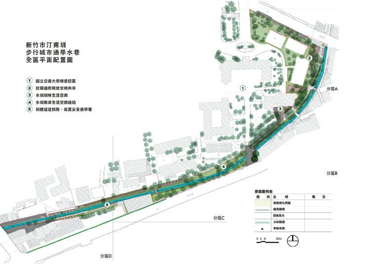 帶與市民共同生活圈,也為新竹市帶來前所未有 的步行環境大改造,讓每一次出門散步,就 是一次微旅行。 八年來市府團隊推動 「步行城市」理念,與一 群台灣最優秀的建築師及景 觀建築師,超過百次的重大建 設會報,從對城市環境的認識, 從城市中的藍帶與綠帶、從郊山到海 岸、從歷史人文場域到綠色基盤,一步 b a.關埔國小一期範圍配置圖。 ( 田中央聯合建築師事 務所提供 ) b.新竹公園再生計畫園區平面圖 ( 樂駝規 劃設計有限公司提供 )
