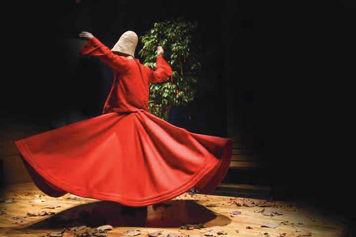 Cara Tabachnick witnessed a sema in person and described it for Washington Post readers: “The dancers, who fast for many hours before the ceremony, start to turn [counter-clock-wise] in rhythmic patterns, using the left foot to propel their bodies around the right foot with their eyes open, but unfocused. Their whirling is fueled by accompanying music, which consists of a singer, a flute-player, a kettle drummer, and a cymbal player. As the dancers turn, the skirts of their robes rise, becoming circular cones, as if standing in the air on their own volition. A team of researchers found that the edges of spinning skirts experience accelerations ‘of about four times Earth gravity,’ reporting that the skirts ‘carry cusped wave patterns which seem to defy gravity and common sense.’”