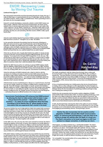 EMDR: Recovering Lives by Moving Out Trauma Continued from page 57 But what protects Kennard the most from becoming burned-out is hope. She says, “I really do think hope…is a great protection for me…It really helps. And I do see them [my clients] progress, which is really a wonderful honor. What a great thing to have a job where you can see people healing!” Kennard is currently developing a community website in which EMDR trainers can talk to people. Called the Center for Personal Transformation, the theme of this website is how to actively open up the heart in order to discover one’s path in life. “That’s really how I see my clients,” Kennard says. “What they really need is to get whatever there is out of the way that keeps them from having an open heart, from just being who they are, and connecting with their essence. EMDR is really a great tool for that.”