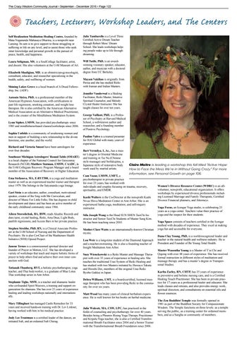 Women’s Divorce Resource Center (WDRC) is an allvolunteer, non-profit, educational organization. It offers workshops by experienced divorce professionals including Licensed Marriage and Family Therapists, Certified Divorce Financial planners, and Attorneys. Yoga Focus, an Iyengar Yoga studio, is celebrating 25 years as a yoga center. Teachers value their practice of yoga and the respect for their students. Yoga Space consists of teachers certified in the Iyengar method with decades of experience. They excel at making yoga fun and accessible for everyone. Dana Clay Young, PhD, is a world-recognized leader and teacher in the natural health and wellness industry. He is President and Founder of Be Young Total Health. Master Wasentha Young is a Master of T’ai Chi and Qigong with over 48 years of experience. She has received formal instruction in different styles of meditation and massage therapy and has a master’s degree in Transpersonal Studies. Karlta Zarley, RN, CHTP, has 35 years of experience in preventive and holistic nursing care, and is a Certified Healing Touch Practitioner. She has been in private practice for 17 years as a professional healer and educator. She leads classes and retreats, and also provides energy work, spiritual direction, and consultations on essential oils and flower essences. The Zen Buddhist Temple was formally opened in 1981 as part of the Buddhist Society for Compassionate Wisdom. The Temple functions on three levels: as a temple serving the public, as a training center for ordained members, and as a Sangha or community of members.