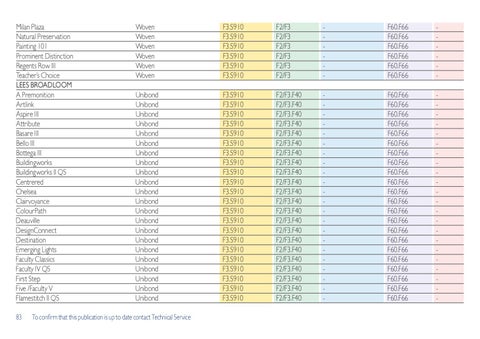 Milan Plaza Natural Preservation Painting 101 Prominent Distinction Regents Row III Teacher’s Choice LEES BROADLOOM A Premonition Artlink Aspire III Attribute Basare III Bello III Bottega III Buildingworks Buildingworks II QS Centrered Chelsea Clairvoyance ColourPath Deauville DesignConnect Destination Emerging Lights Faculty Classics Faculty IV QS First Step Five /Faculty V Flamestitch II QS 83