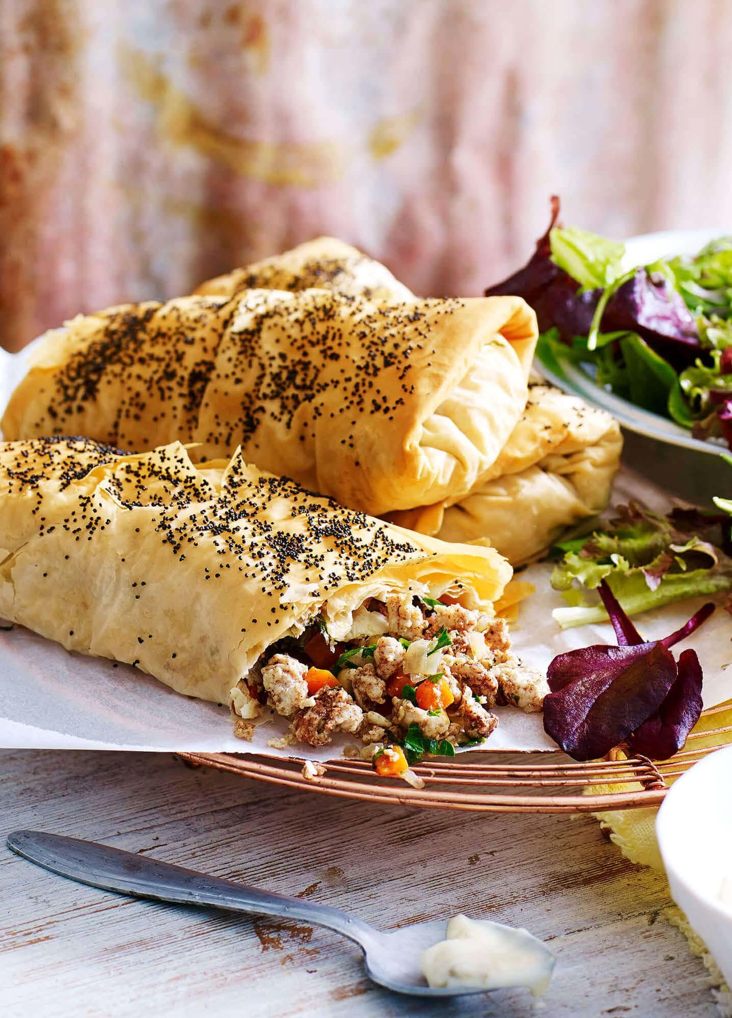 5. Lightly spray the filo tops with olive oil and sprinkle with poppy seeds. Bake for 20–25 minutes or until golden and crisp. Serve with jalapeno aioli and mixed leaf salad.