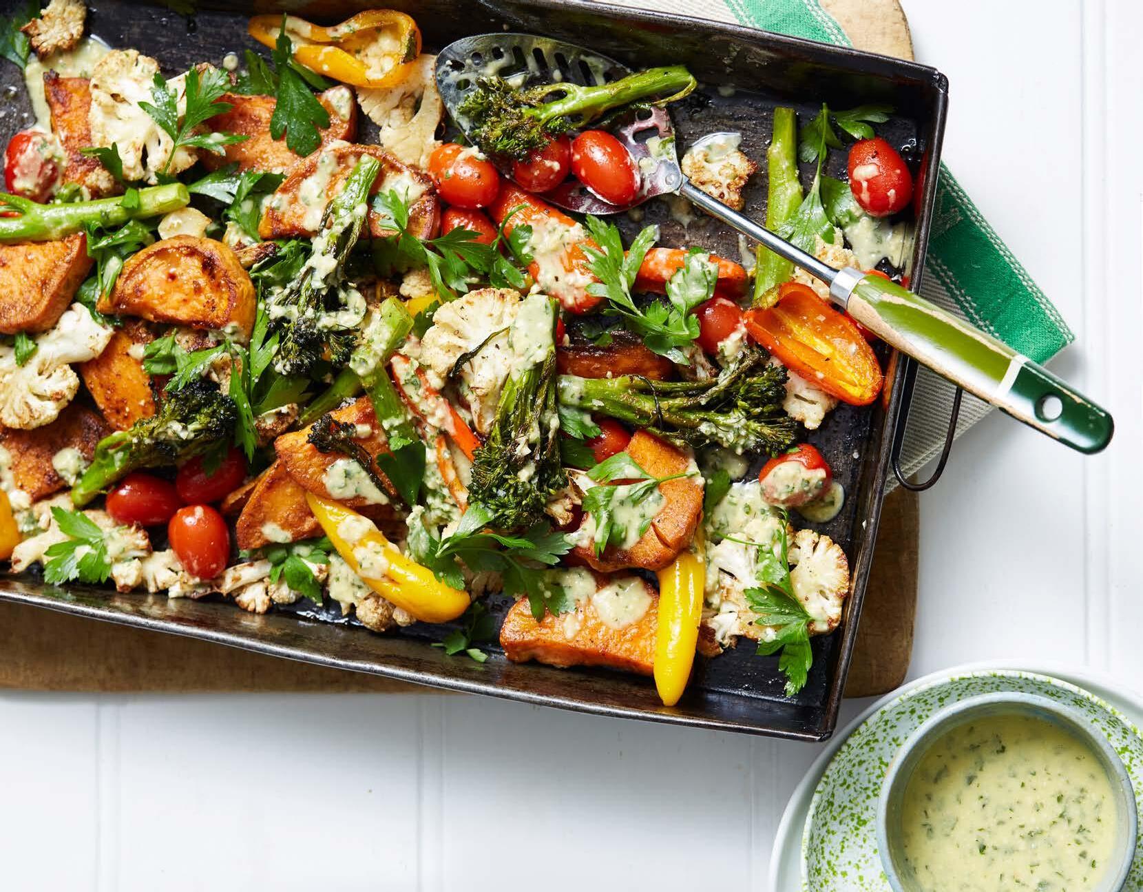 1. Preheat the oven to 220°C. Grease a large roasting pan. Arrange the sweet potato and cauliflower in the roasting pan. Combine the oil and spices together. Spoon half over the vegetables in the roasting pan. Season, roast for 25 minutes until tender.