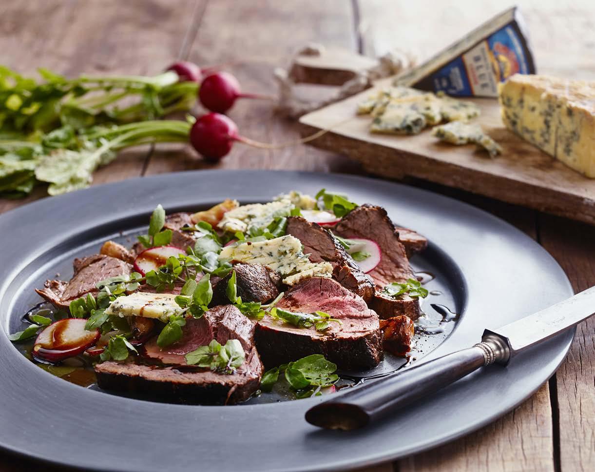 5. Slice beef, reserving any juices, and arrange on a board or platter. Arrange watercress, radishes and roasted garlic over beef and crumble King Island Dairy Roaring Forties Blue over the top.