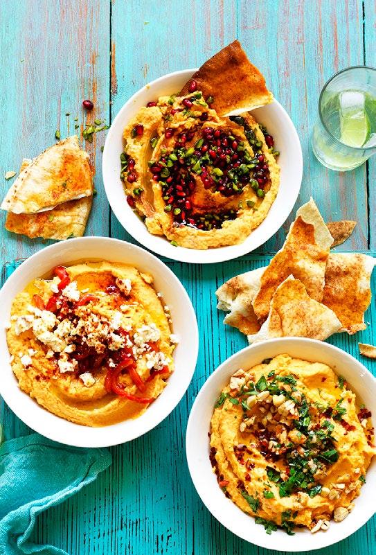 Top hummus with fire roasted capsicum, feta and smoked paprika. Serve drizzled olive oil. Accompany with pita crisps.