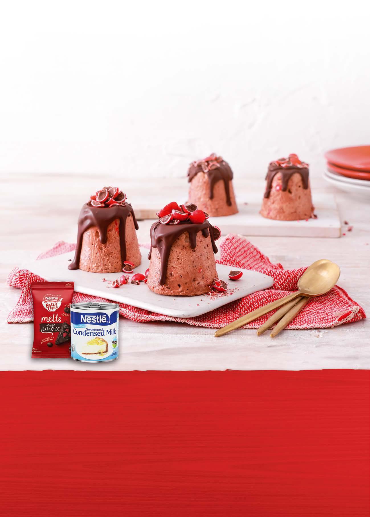 Invert the puddings onto serving plates (Use a warm cloth to rub over mould if they need a little help to become loose). Spoon reserved NESTLÉ Bakers Choice Dark Melts over each puddling and let choc drizzle down sides slightly; decorate with reserved ALLEN’S JAFFAS.
