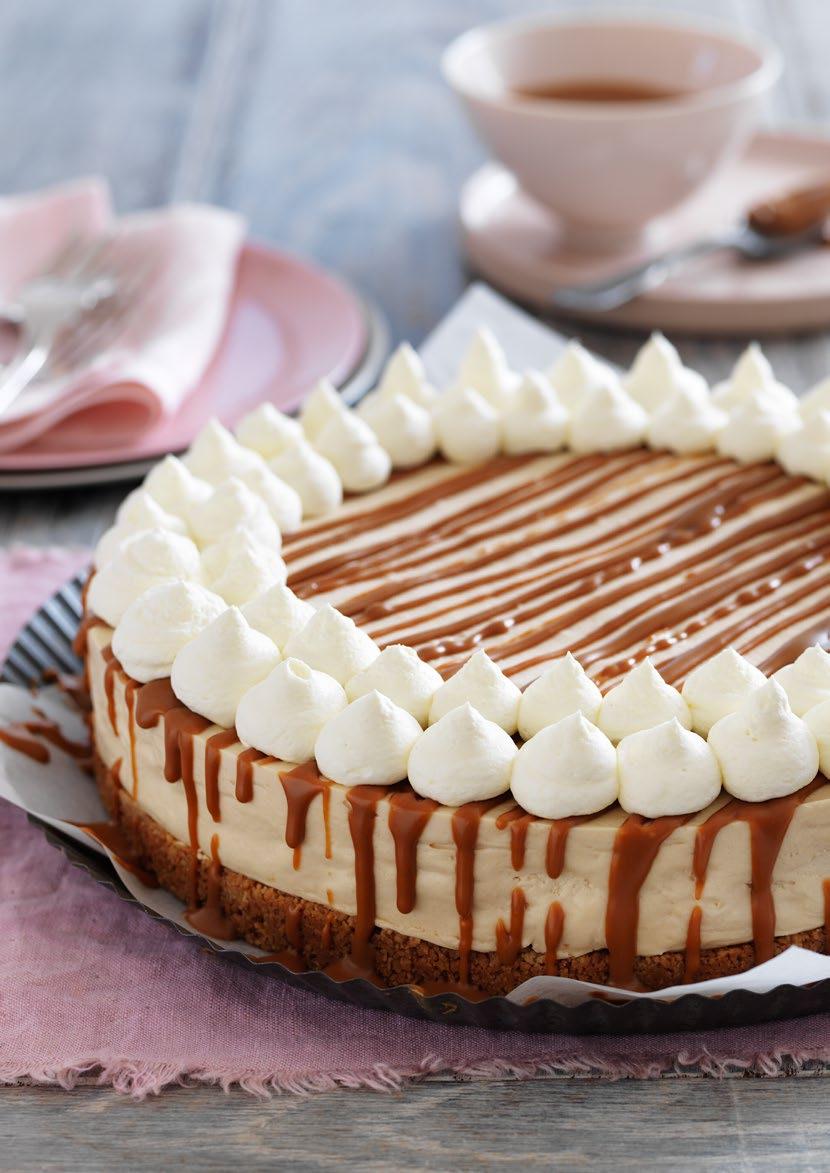 8. Whip cream until firm peaks form. Place cream into a piping bag fitted with a 1cm plain piping tube. Pipe two rows of cream buttons around the edge of cheesecake.