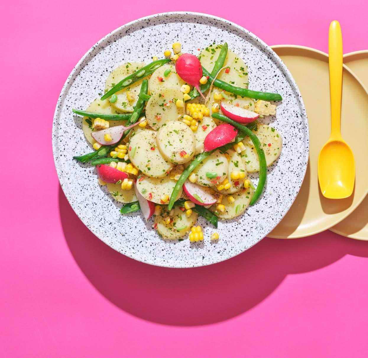 3. To make the wreath, place a large platter on the bench, then arrange the sliced baby cos in a circle. Add the radish, red onion, baby cucumbers and cucumber florets evenly around and over the baby cos.