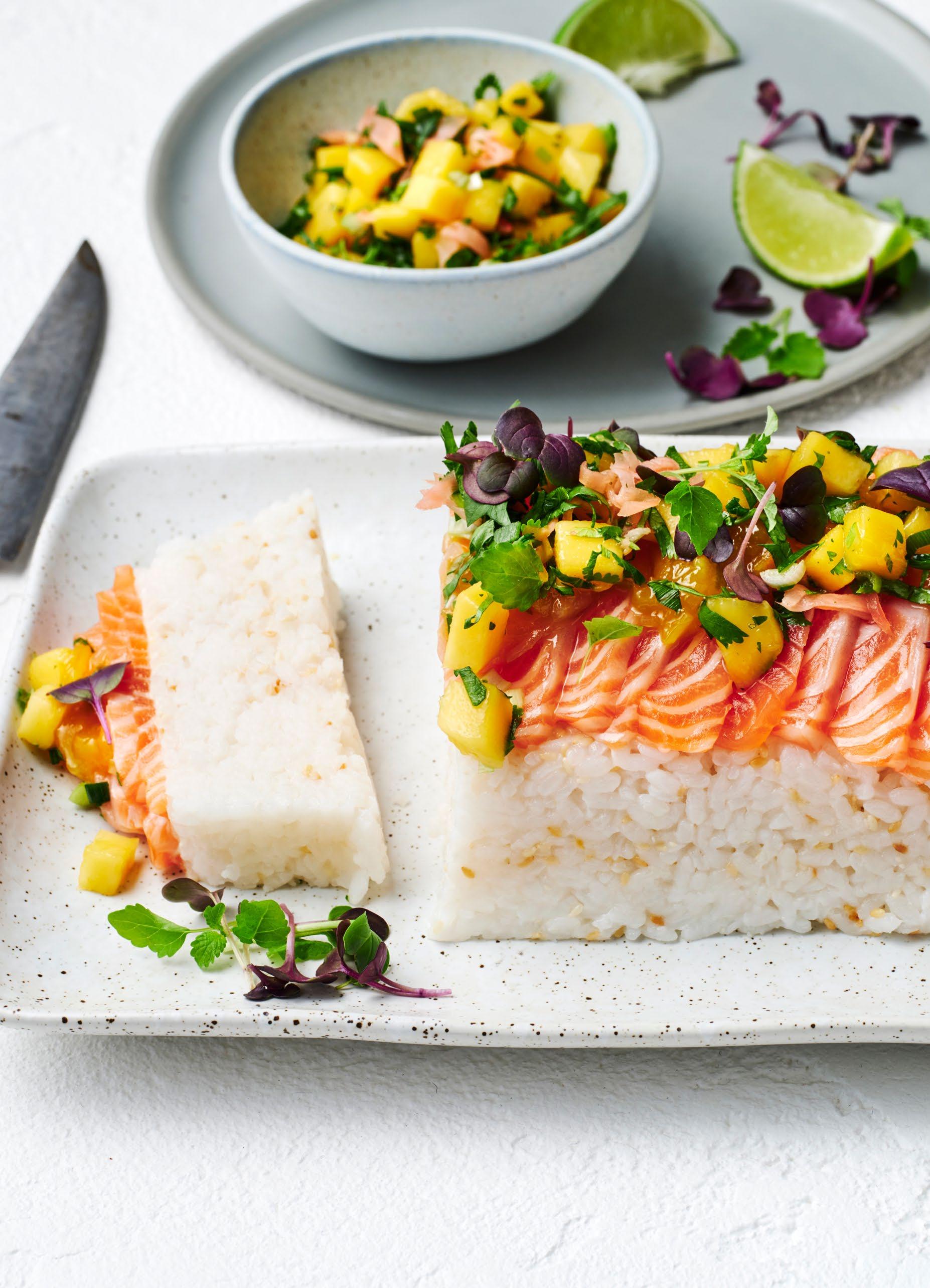 5. Turn the rice out onto a serving board or plate. Spread the top with mayonnaise. Top with two layers of salmon. Spoon some of the cooked mango salsa over the top, then spoon over some fresh mango salsa. Scatter with micro herbs. Serve with remaining fresh and cooked salsa.
