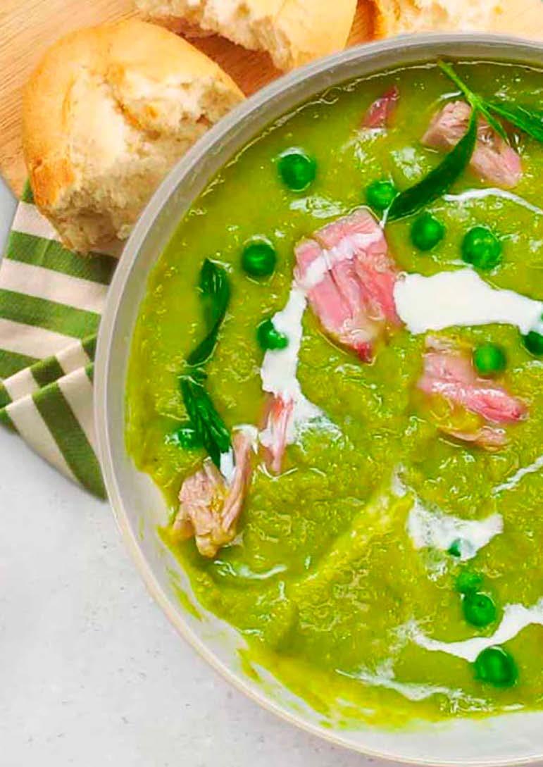 6. Add the reserved Ham chunks and peas to the soup. Serve hot with a swirl of cream and toasted sour dough bread with herb butter.