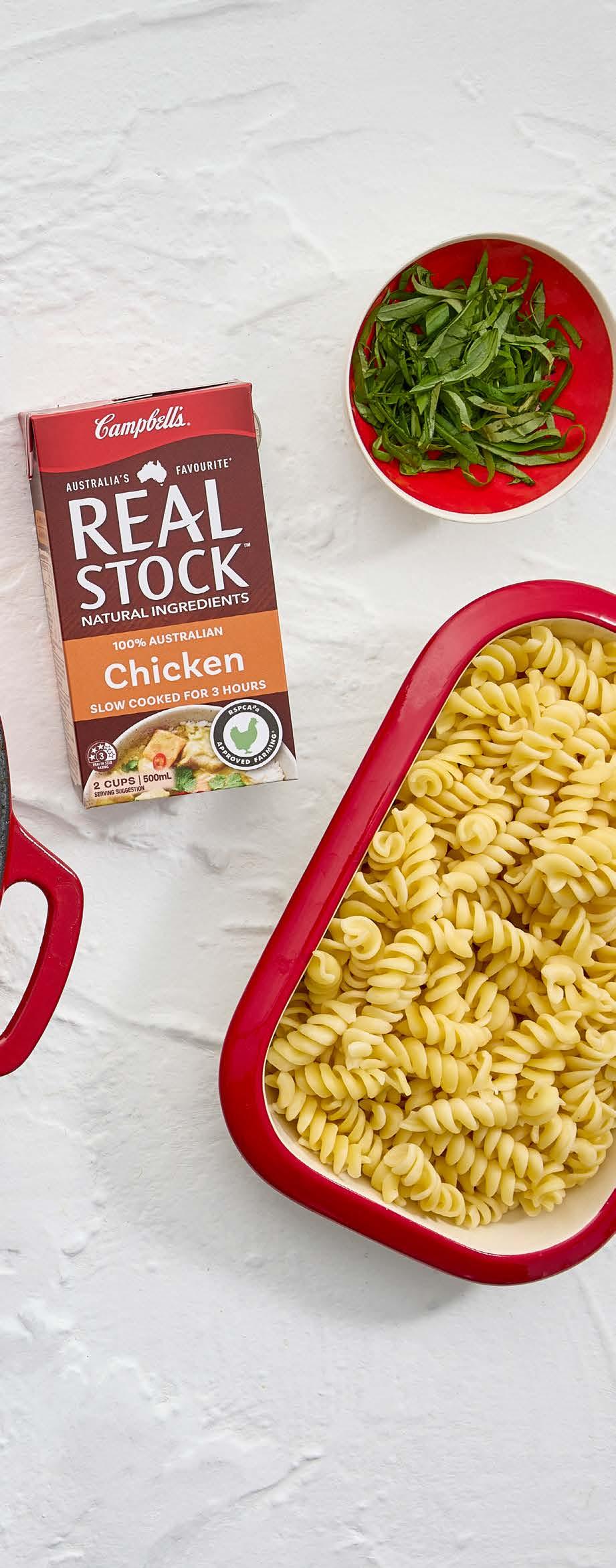 2. Melt butter in a large frying pan. Cook chicken until browned. Remove chicken from pan and set aside. Add garlic, tomatoes, tomato paste and Campbell’s Real Stock Chicken to the pan. Bring to the boil, return chicken and add cream, simmer for 10 min until chicken is cooked through. Sprinkle with fresh basil and parmesan to garnish.