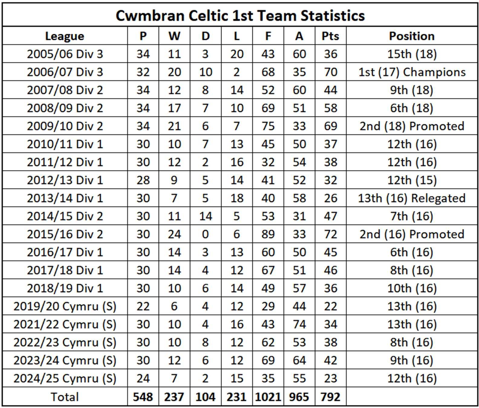 In2012/13withheadcoachDellaCheedyatthe helm,Celcstartedbrightlywithsomefine performancesincludinga4-2winversus reigningchampionsCambrian&Clydachbut theylosttheirwayintheNewyearandatone stagewereinlastplace.However,with characteriscdeterminaontheydragged themselvesupthetableandsealedanother seasoninthetopdivisionwitharesounding51winagainstHaverfordwestCounty.Under SteveMorganin2013/14Celc underperformedfinishing4thfromboomand withAfanLidorelegatedfromtheWelsh PremierLeague,Celcwererelegateddespite appealingtoanFAWarbitraon.WithDella Cheedybackasmanagerin2014/15Celc finished7thinDivision2.