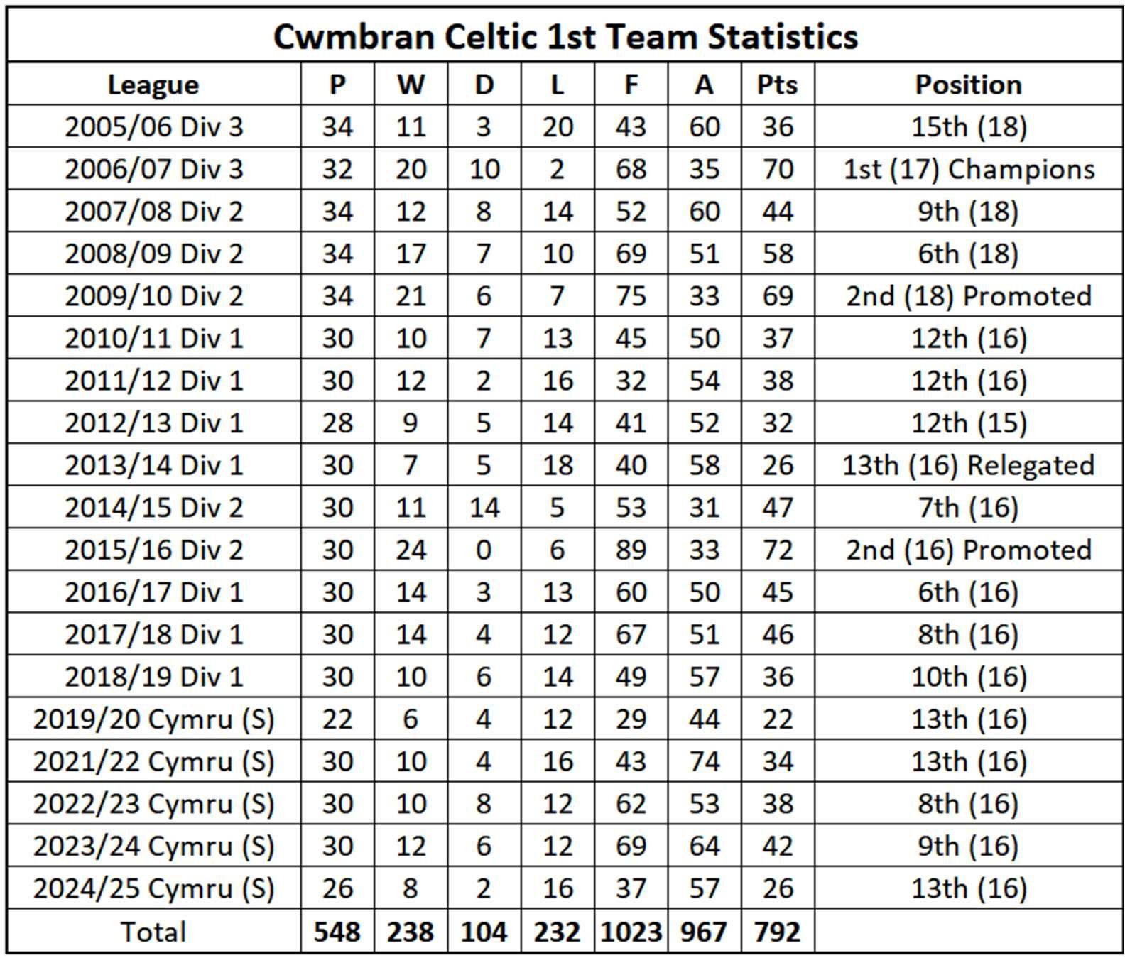 In2012/13withheadcoachDellaCheedyatthe helm,Celcstartedbrightlywithsomefine performancesincludinga4-2winversus reigningchampionsCambrian&Clydachbut theylosttheirwayintheNewyearandatone stagewereinlastplace.However,with characteriscdeterminaontheydragged themselvesupthetableandsealedanother seasoninthetopdivisionwitharesounding51winagainstHaverfordwestCounty.Under SteveMorganin2013/14Celc underperformedfinishing4thfromboomand withAfanLidorelegatedfromtheWelsh PremierLeague,Celcwererelegateddespite appealingtoanFAWarbitraon.WithDella Cheedybackasmanagerin2014/15Celc finished7thinDivision2.