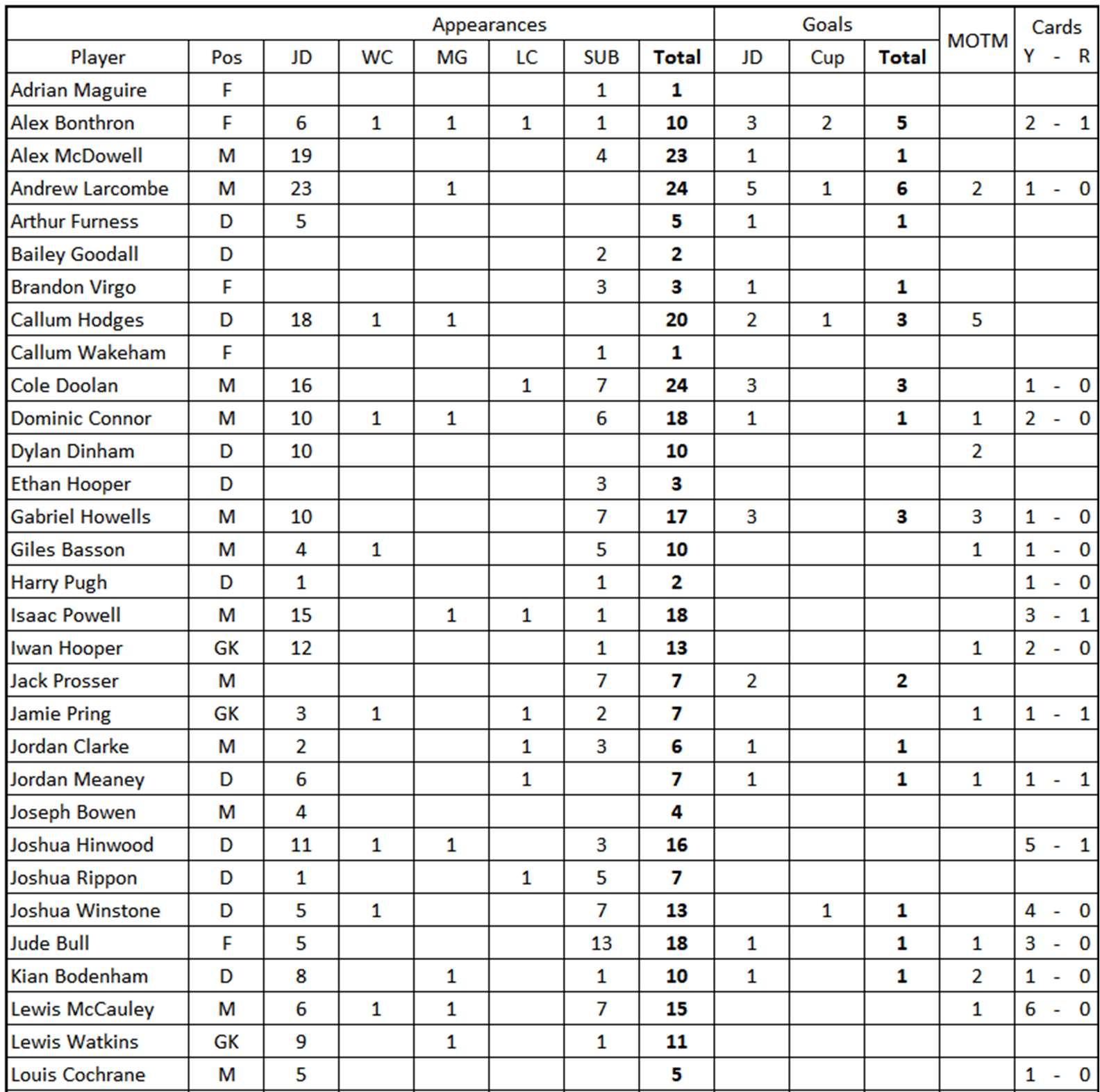 AndrewLarcombe:centreback,age36.Joined2014/15.CaptainFantasc.Canalsoplay midfield,striker&stand-ingoalkeeper.PreviouslywithEveswelljuniors,NewportYM youth,LiswerryGwentCounty;WelshLeagueforLlanwern(2010-13)&UndyAthlec (2013-14).Debut:BlaenavonBluesSep14.[266/24]