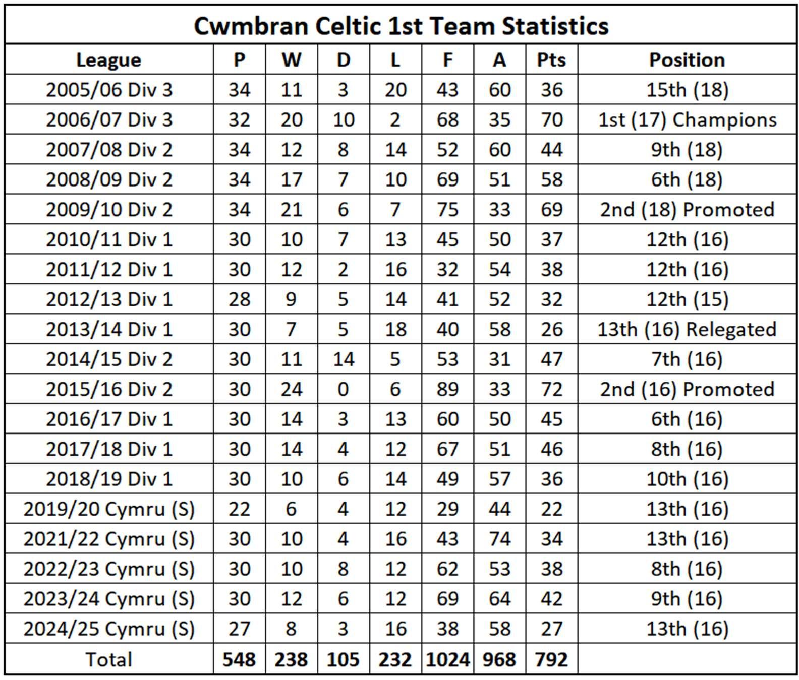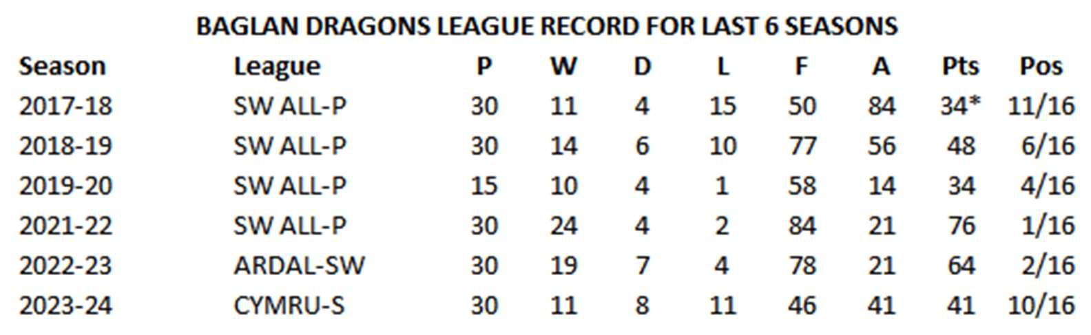 The23/24seasonsawourdebutintheCymruSouth,wherewefacednewchallengesin thefaceofquitesubstanalbudgetsbutwemorethanheldourown,finishingina respectable10thposion,withnotablevictoriesagainstlocalrivalsAfanLido,Goytre United,TrefelinandPontardaweTown.Inthesameseason,ourfirstteambowedoutof theWelshCuponpenalesawaytoPremierLeagueouitHaverfordwestCounty. Meanwhile,ourreservescomfortablywontheFAWreservesSouthWestleaguewhileour FAWYouthleague,SouthWalesYouthLeagueandunder16sidesplayedoutrespectable seasonsintheirfirstseasonwithBaglanDragons.