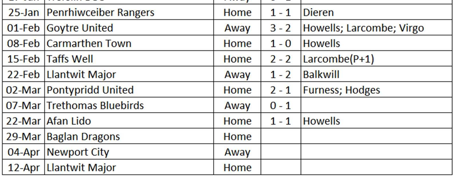 GabrielHowells:forward,age17.ProductofCelcAcademy.Debut:TaffsWell23.[1/1] CallumWakeham:striker;age26.Returnedtoclubintransferwindow.Formerclubs: CaldicotTown,Panteg,CoedEva.Debut:Cambrian&ClydachJan17.