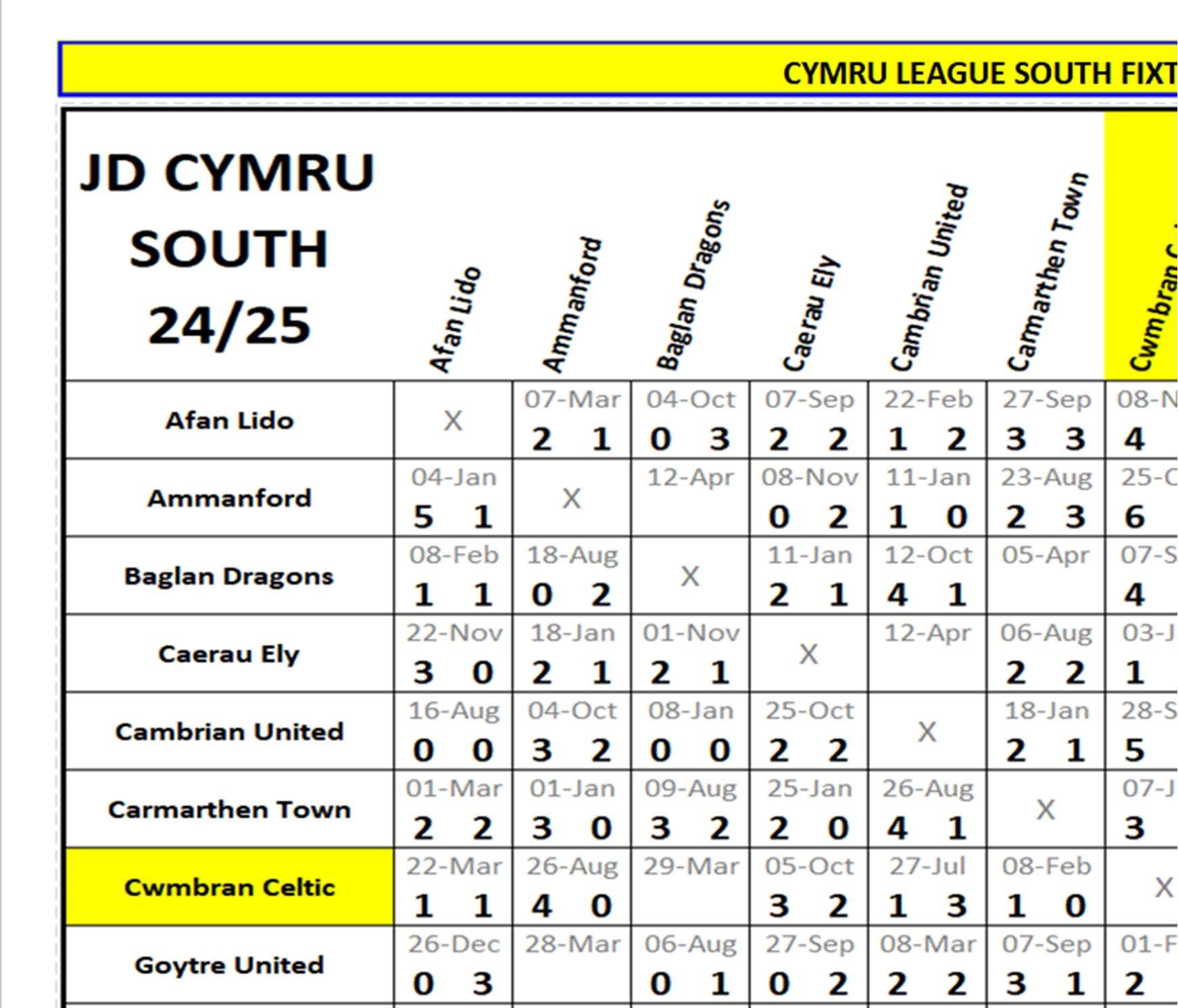 InthegameattheEvansBevangroundtheteamsplayedouta3-3 draw,Celc’sgoalsfromJoshHinwood,HarrisonLewisandanAlex Bonthronpenalty.ThereturngameatCelcParkwasa1-1draw.A goalinmeaddedonbyCallumHodgesearnedthepointforCelc. Thisseason’sgameatBaglanwasagoalfest,theDragonscomingout top4-3.Celcwere3-1upthroughgoalsbyKianBodenham,Alex BontrhonandJordanClarkebuttheDragonsscoredthree2ndhalf goalstosnatchthe3points.