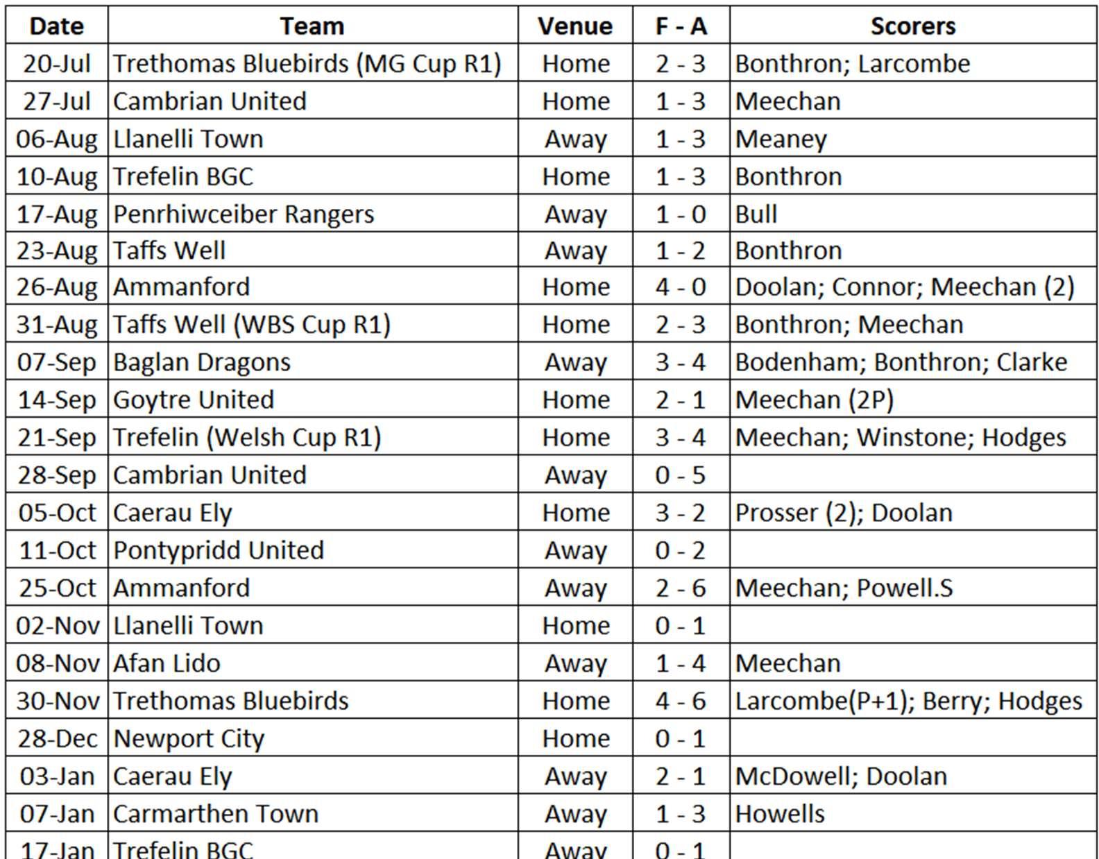 straightwins.Theclubalsoreachedthequarter finalsoftheWelshCup,goingdown2-1aera bravefightathometoWPLsidePortTalbot. JoshBullwastheWelshLeague’stopscorer with32leaguegoals.