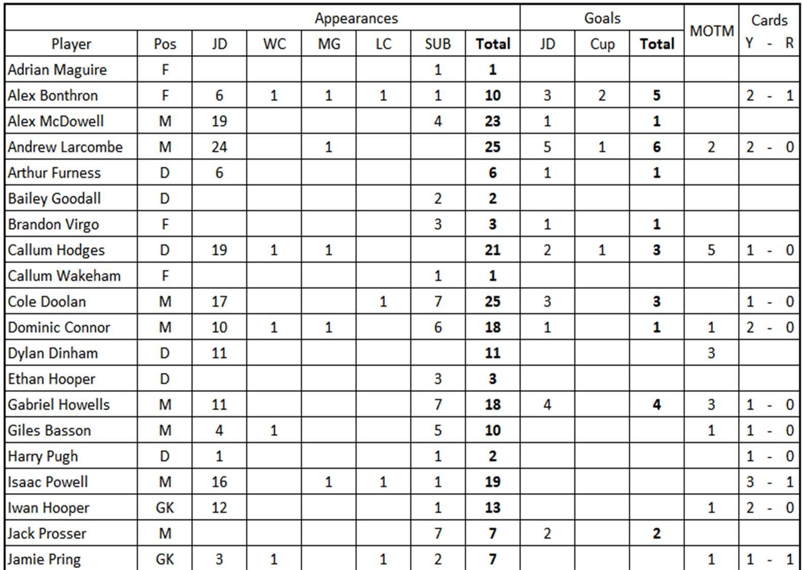 AndrewLarcombe:centreback,age36.Joined2014/15.CaptainFantasc.Canalsoplay midfield,striker&stand-ingoalkeeper.PreviouslywithEveswelljuniors,NewportYM youth,LiswerryGwentCounty;WelshLeagueforLlanwern(2010-13)&UndyAthlec (2013-14).Debut:BlaenavonBluesSep14.[266/24]