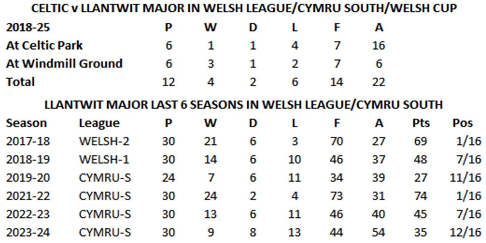 LastseasonBonthronagainscored2goalsinCelc’s2-1winatCelcParkwhichendedCelc’srun of8successivehomegameswithoutawin.IntheawaygameLewisIlesscoredinhis100thgame forCelcastheteamsdrew1-1.ThisseasonLlantwitwon2-1attheWindmillGround.Oscar BalkwillscoredforCelc.