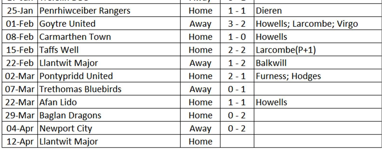 GabrielHowells:forward,age17.ProductofCelcAcademy.Debut:TaffsWell23.[1/1] CallumWakeham:striker;age26.Returnedtoclubintransferwindow.Formerclubs: CaldicotTown,Panteg,CoedEva.Debut:Cambrian&ClydachJan17.