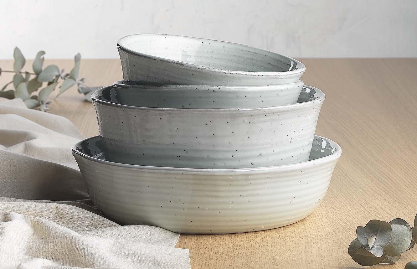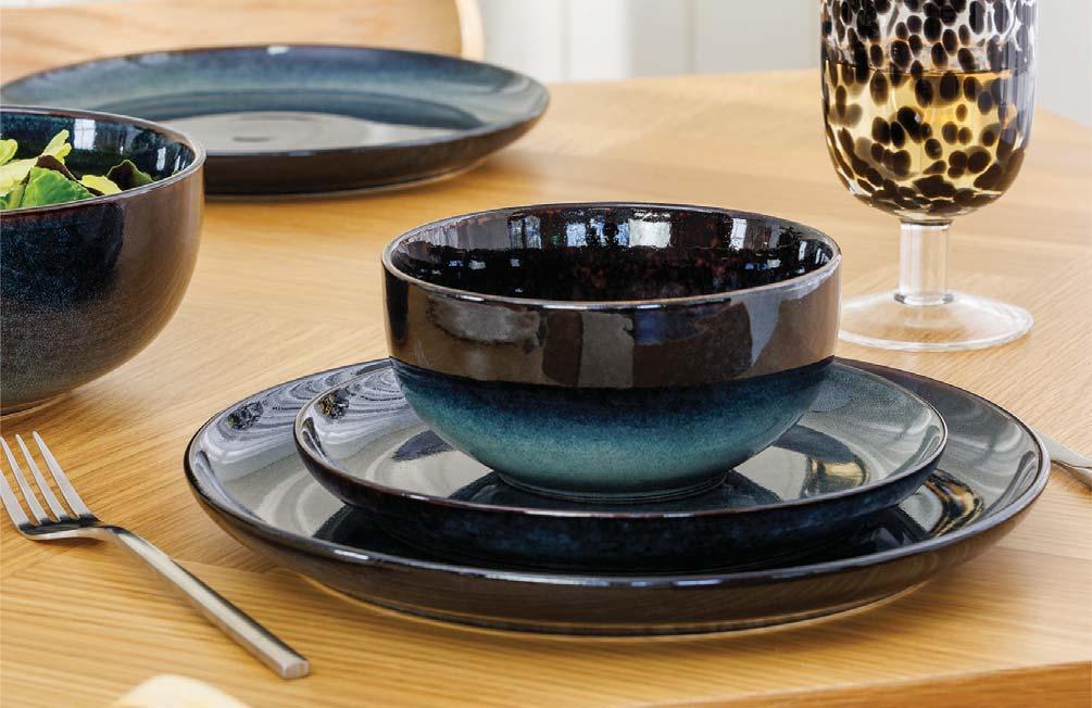 This stoneware collection offers an organic shape with a high gloss outer and a flat-profile, exposed base. The rims are emphasised by a neutral hue and contrast against the reactive blue glaze as it washes across the cream-toned base.