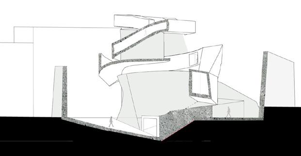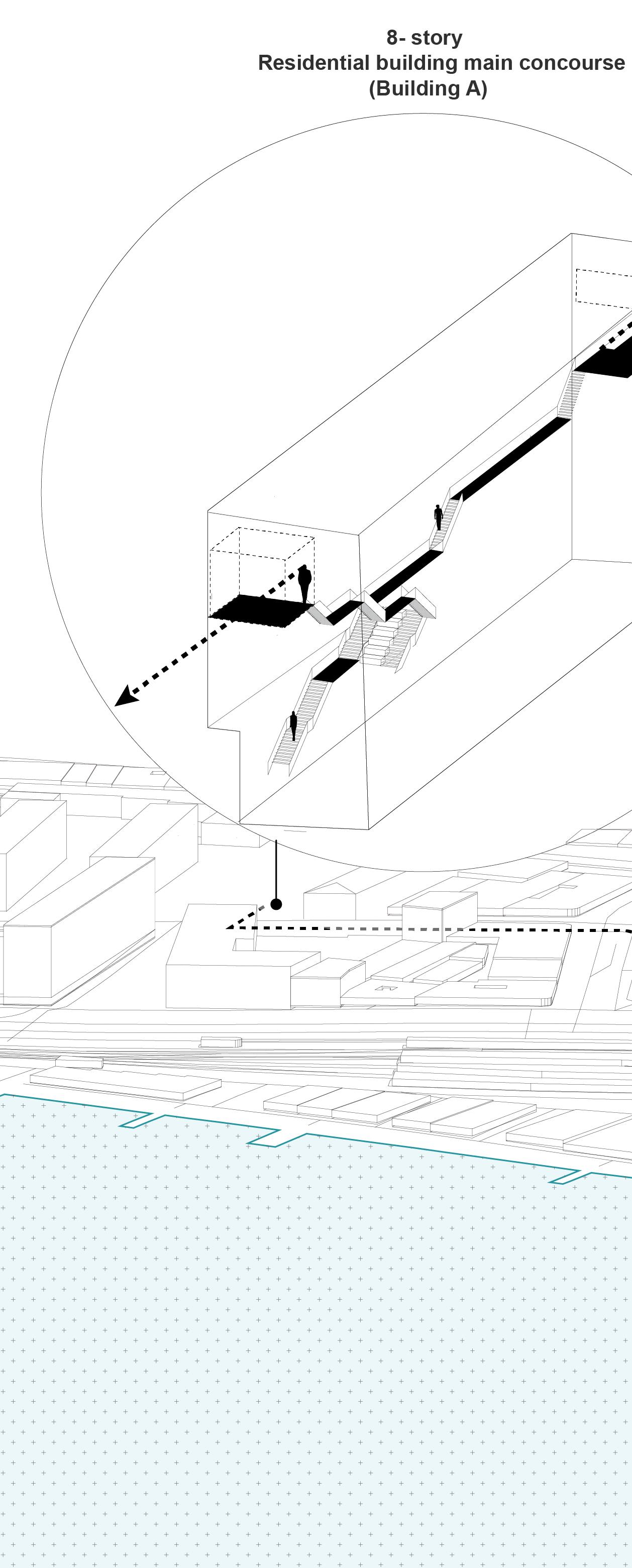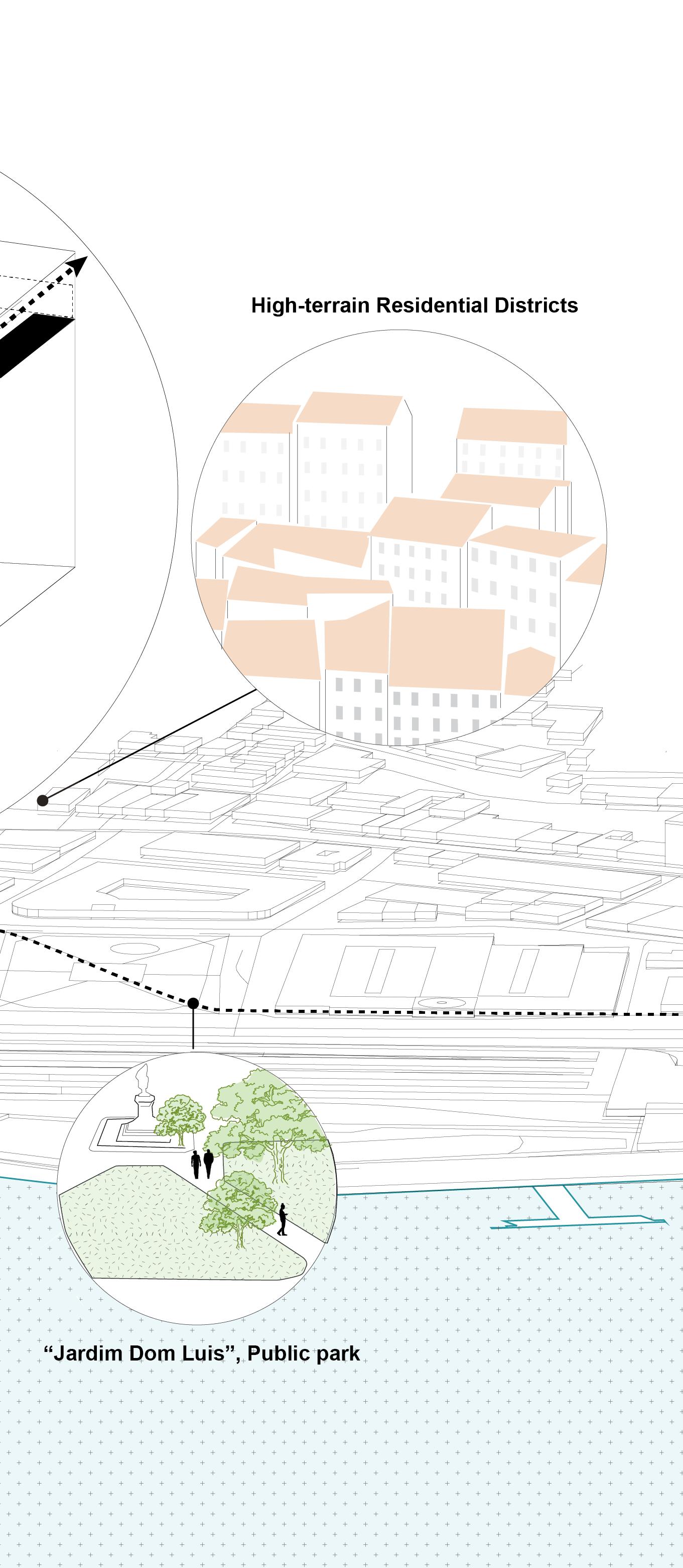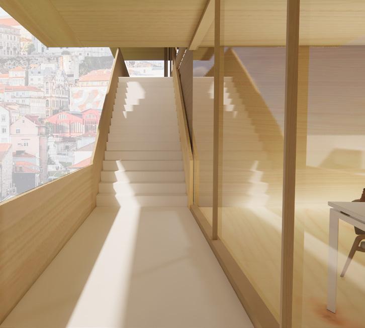 Considering these three design tasks as a newly built “campus” which will have an integrated networking and circulation system between them, the residential building has a public concourse, moving people up in order to encounter the different urban characteristics and settings of Lisbon – the Tagus river and the hillside topography.