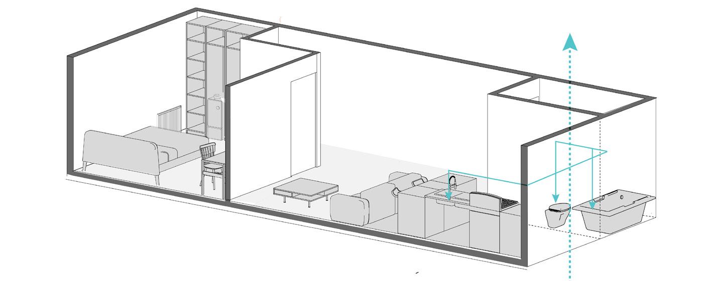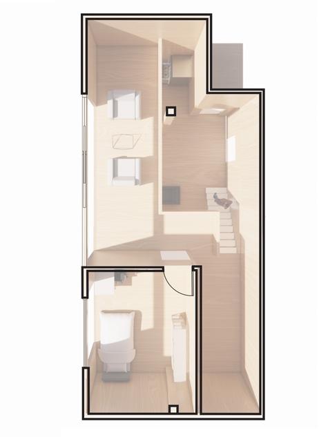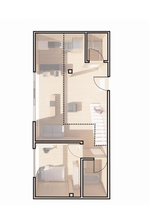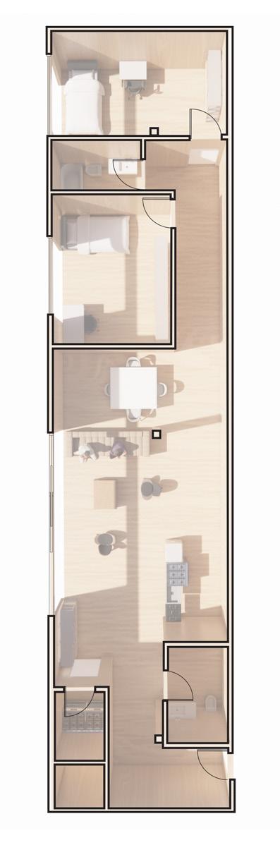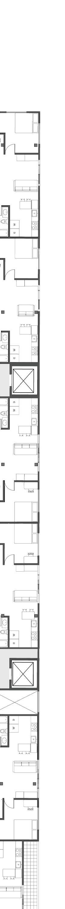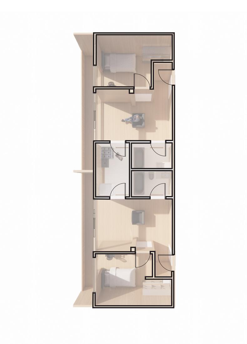 Co-living Units for two people with shared kitchen areas are for resident artists and workers in renovated Lisbon audio library located right next to the residential building. This unit types is mostly located on second floor so as to easily access to the library and public concourse of the residential building.