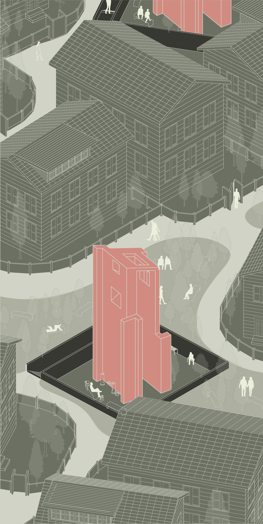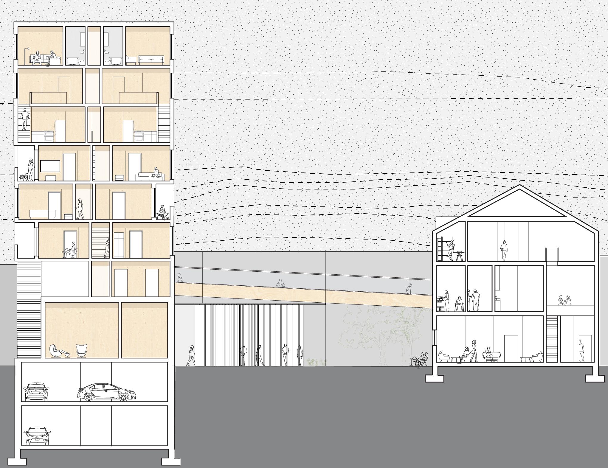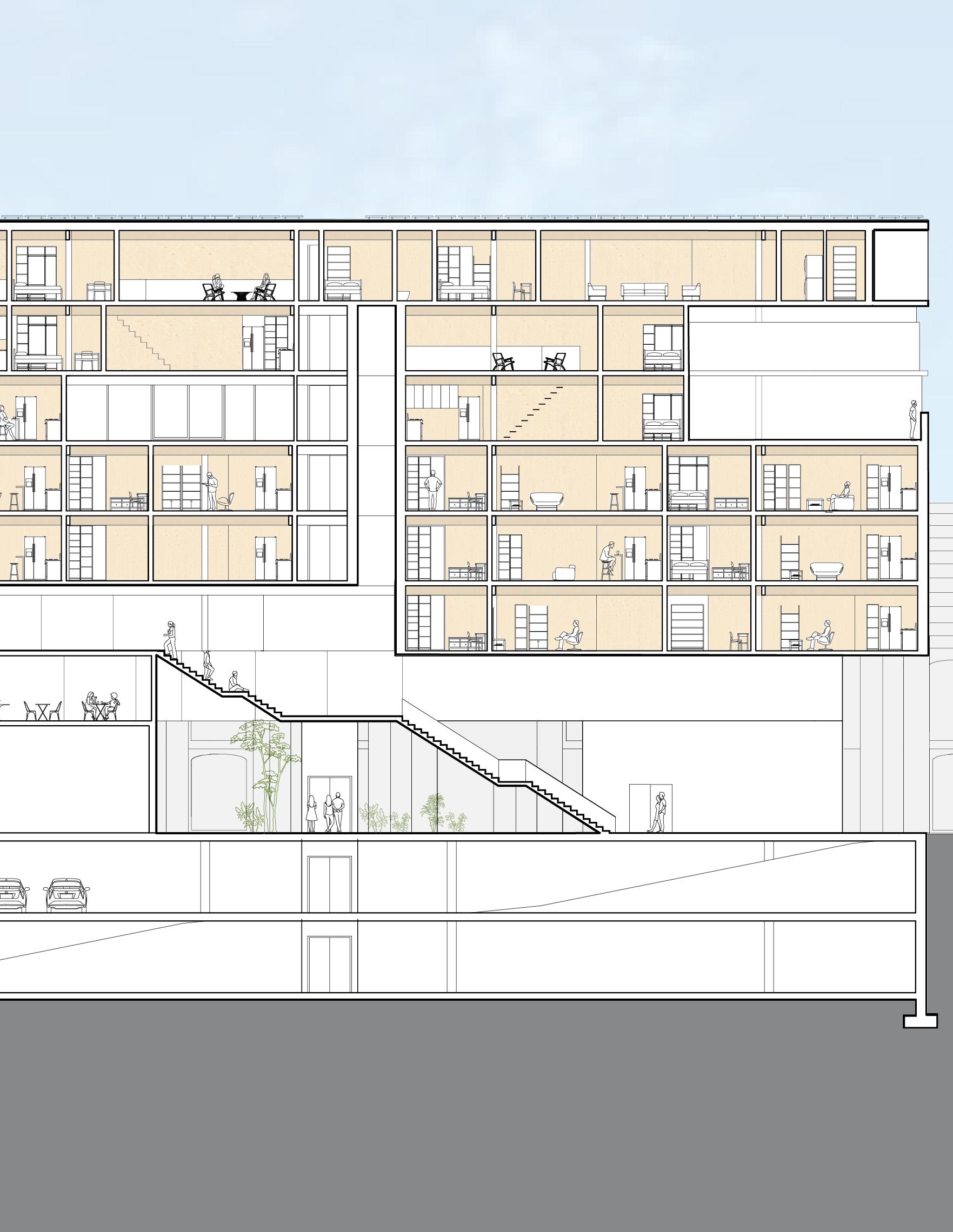The main proposal is to revitalize public and clutural use of the original plot, close to Tagus river, by designing landscape and 8-story residential building and renovating an existing 3-story building to create new video library located in Lisbon, Portugal. Also, it aims to exhance the original urban context and offer sustainable living with the use of timber wood construction and minimal energy use.