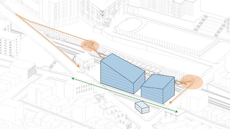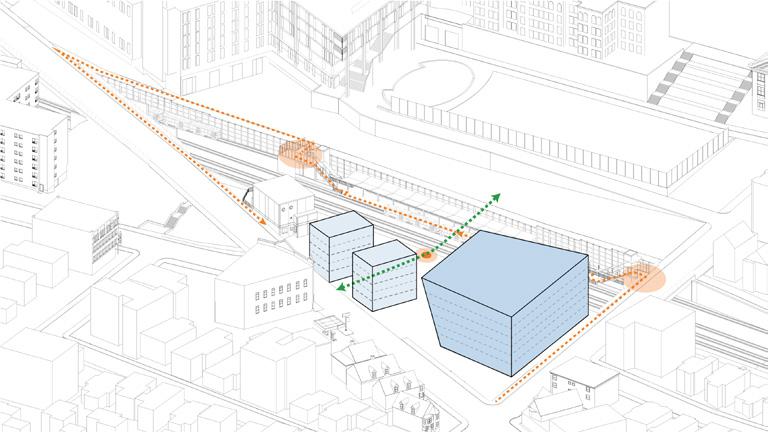 Massing studies tested various possibilities of connections between MBTA train station, pedestrians, and cars.