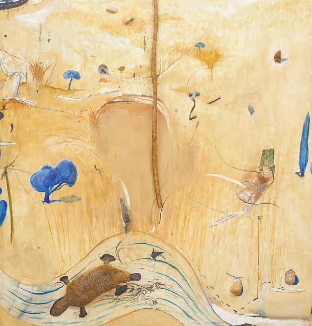 Tipoti’s work employs complex background designs, disguised among ritual objects and land and sea creatures, offering his depictions of their environmental and spiritual world.