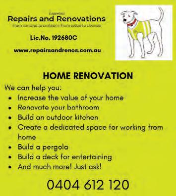 TRADES&SERVICES TRADES&SERVICES TRADES&SERVICES TRADES&SERVICES • Undercover • Safe clean secure dog kennels for boarding use. • Individual exercise yards. Dog B&B Shangri La Amaroo Rd Molong 6366 8789 0447 468 789 PETS&LIVESTOCK Residential - from one room to the whole house New houses to repaints, No job too big or too small Fully licenced and Insured Local family business 0448 600 095 upanddownpainting@gmail.com Lic. No. 340514c PAINTING UP& D WN experienced builder SpecialiSing in... •Renovations • Kitchens • Restorations •General Maintenance G A & r l bruce Lic. No. 203054C Phone Geoff on 0427 422 816 E robynandbruceg@bigpond.com 0421 861 262 • From one wall to full house • New houses to repaints • Free quotes • Fully licensed and insured • Interior and Exterior • Specialising in Restora�on • Dulux Accredited WASP treatment From $150 25 years experience Call Craig... 0447 002 193 Eagle Eye Pest Control Lic. no. 4558 100%NESTELIMINATED GUARANTEED “Where our customers are the heart of the community” A decadent range of cakes and desserts that will tempt the sweetest of tooths Delicious cakes • 24hr Emergency Service • Commercial & Residential Locks • Window Locks and Deadlocks • Master Keying and Restricted systems • Automotive and Computerised keys • Locally Owned and Operated for over 30 years Canobolas Locksmiths 169 March Street, Orange Call Ian: 0417 204 176 or Dale: 0417 491 936 keys4u@bigpond.com MASTER LICENSE NUMBER 407 966 923 24 Hour Mobile Service When you have lock problems – call us! Also deadlocks and window locks for houses and cars supplied and installed 151 Peisley St, Orange 6369 1222 or 0417 204 176 Canobolas Locksmiths keys4u@bigpond.com WE FIX LOCKS! NEW LOCATION CLASSIFIEDS 6361 3575 To book your ads simply phone and use your credit card or call into our o ce at Suite 3, 241 Lords Place, ORANGE FAST RELIABLE SERVICE Over 25 years experience • Domestic • Rural • Commercial • New installations or maintenance Call Scott 0407 414 609 scott@sdselectrical.com.au BLIND SHUTTERS & AWNINGS HIGH QUALITY AT AN AFFORDABLE PRICE Most products carry a 5 - 25yr warranty BUDGET BLINDS & AWNINGS A local Orange business est. 2012 servicing the Central West Call Milissa for a free measure & quote 02 6369 0173 or 0437 10 60 60 www.bbao.com.au - info@bbao.com.au Lawn Mowing & Rubbish Removal ORANGE AND SURROUNDS 0417 706 613 BUILDER For your: w Addition w New Home w Alteration or Heritage H 40 years experience H FOR ALL ENQUIRIES PHONE Max 0492 803 983 Lic: R79571 MOWING CALL PETER - 0487 139 983 • Gardening • Gutters • Pruning • Rubbish Removal Community Diary onlineFREE