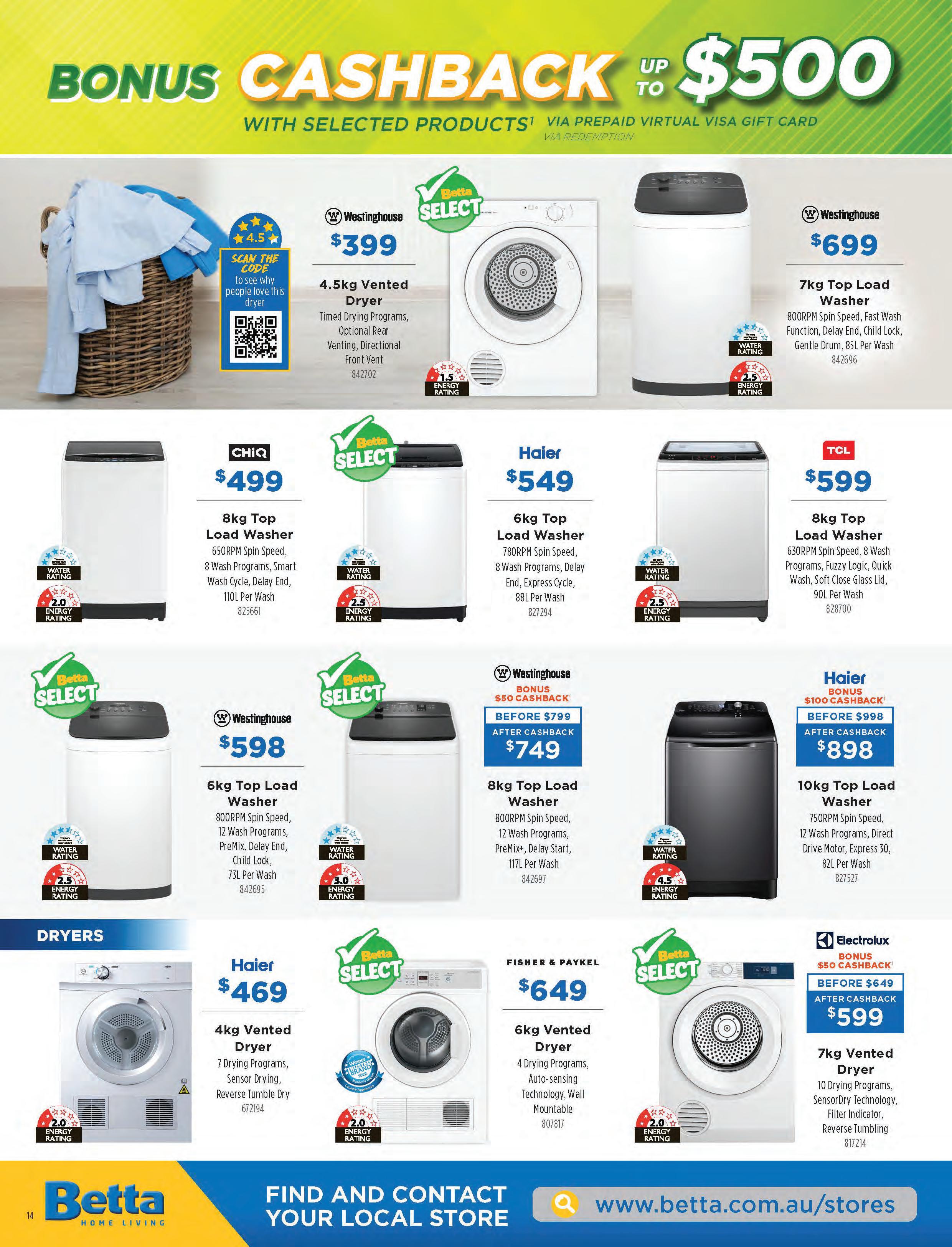 7.5kg Front Load Washer 1200RPM Spin Speed, SteamCure™ , ProSmart Inverter Motor, 65L Per Wash 810112 503L Top Mount Refrigerator SpillSafe™ Glass Shelves, Multi Flow Air Delivert System, LED Lighting, W79 x H 1718 x D727mm 810452 $1095 AFTER CASHBACK $629 BEFORE $679 BONUS $50 CASHBACK1 420L Bottom Mount Refrigerator Adjustable Glass Shelves, Smart Diagnosis™, Multi Airflow, Moisture Balance Crisper, Twist & Serve Ice, Deodoriser, W700 x H1720 x D700mm 759994 $999 Freestanding Dishwasher 15 Place Settings, 6 Wash Programs, ThermoDry System, Adjustable Upper Basket, 11.9L Per Wash 679959 AFTER CASHBACK $899 BEFORE $999 BONUS $100 CASHBACK1 $995 75” 4K QUHD LED Google TV Hands-free Voice Control, Built-in Chromcast, Dolby Atmos® & DTS:HD, 3x HDMI, 2x USB 827231 + EXTENDED WARRANTY www.aircon8years.com.au for details conditions apply. ≈ Terms and conditions apply. YEARS WARRANTY REDEMPTION WHEN YOU SELECTED SPLIT SYSTEM AIR CONDITIONER. ENDS 15TH NOVEMBER ≈ TOWARDS YOUR MORTGAGE ≈ WIN $ 500K