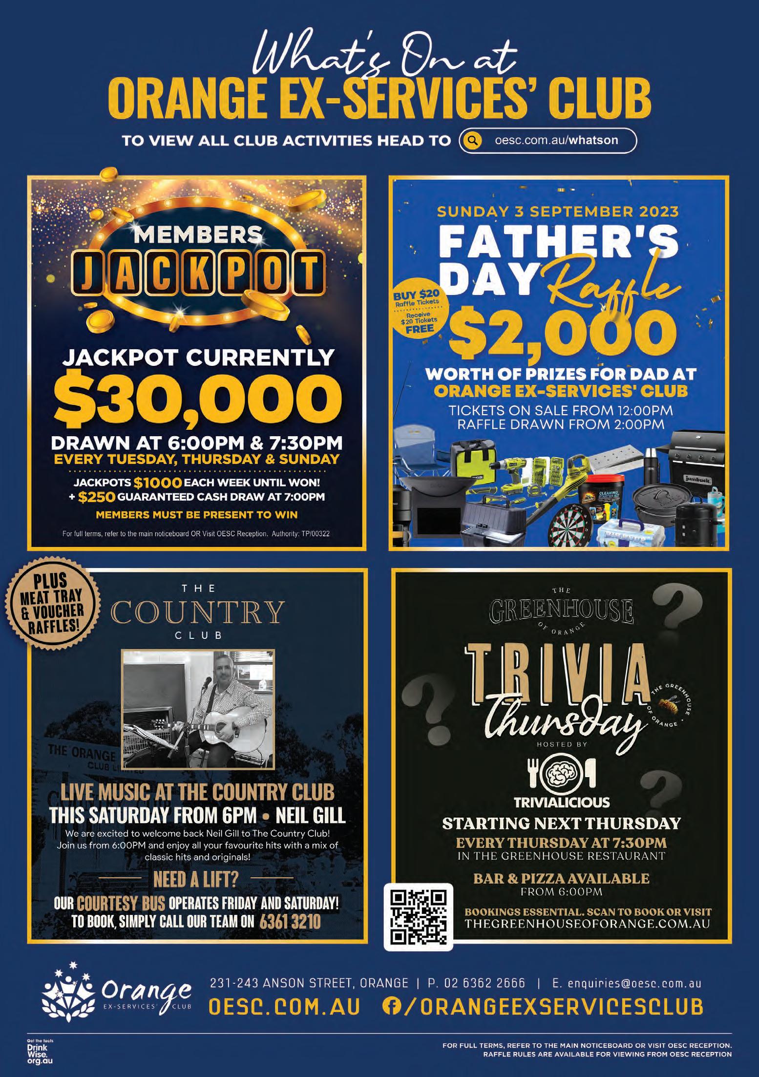ORANGE CITY LIFE | AUGUST 24 — 30, 2023 5 Community LiFE The VicToria hoTel 336 Summer St, Orange | Tel 6362 6386 WHAT’S ON AT THE VIC... POKER TUESDAY from 7pm SATU RDAY from 3.30pm Registration on arrival Registration on arrival SATURDAY 26TH AUGUST 8PM - LATE FREE ENTRY BISTRO TONI & LENNY New 221 Peisley St, Orange. Telephone 6361 7420 SALE TUESDAY 29TH AUGUSTSATURDAY 9TH SEPTEMBER 40% OFF REGULAR PRICED PATCHWORK FABRIC & BACKINGS