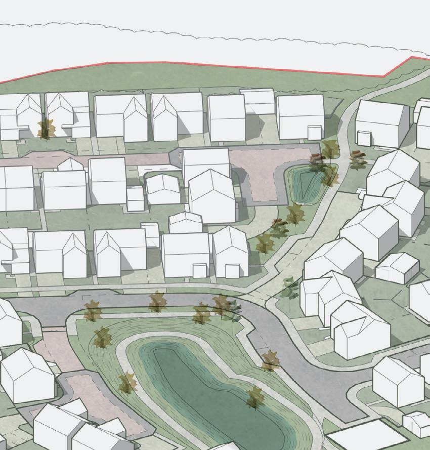 › Ecological areas are retained, including a breeding habitat for crested newts, ponds, mature trees and grasslands