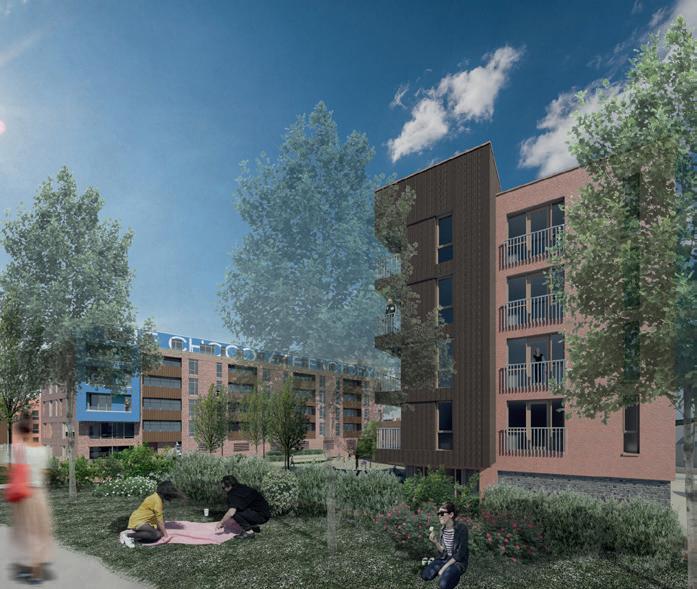 › Includes housing and a school, with the scheme integrating with the commercial facilities on site