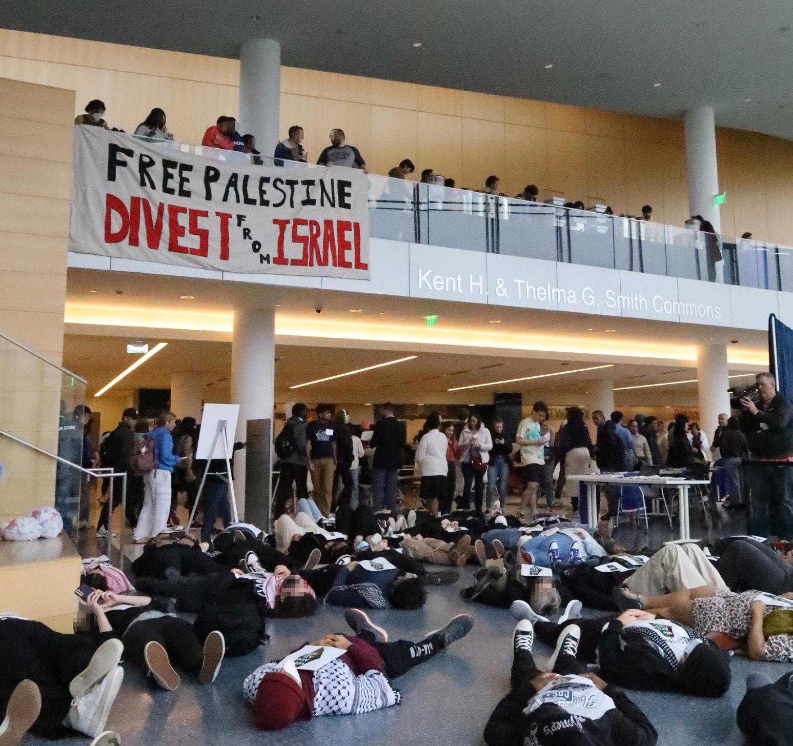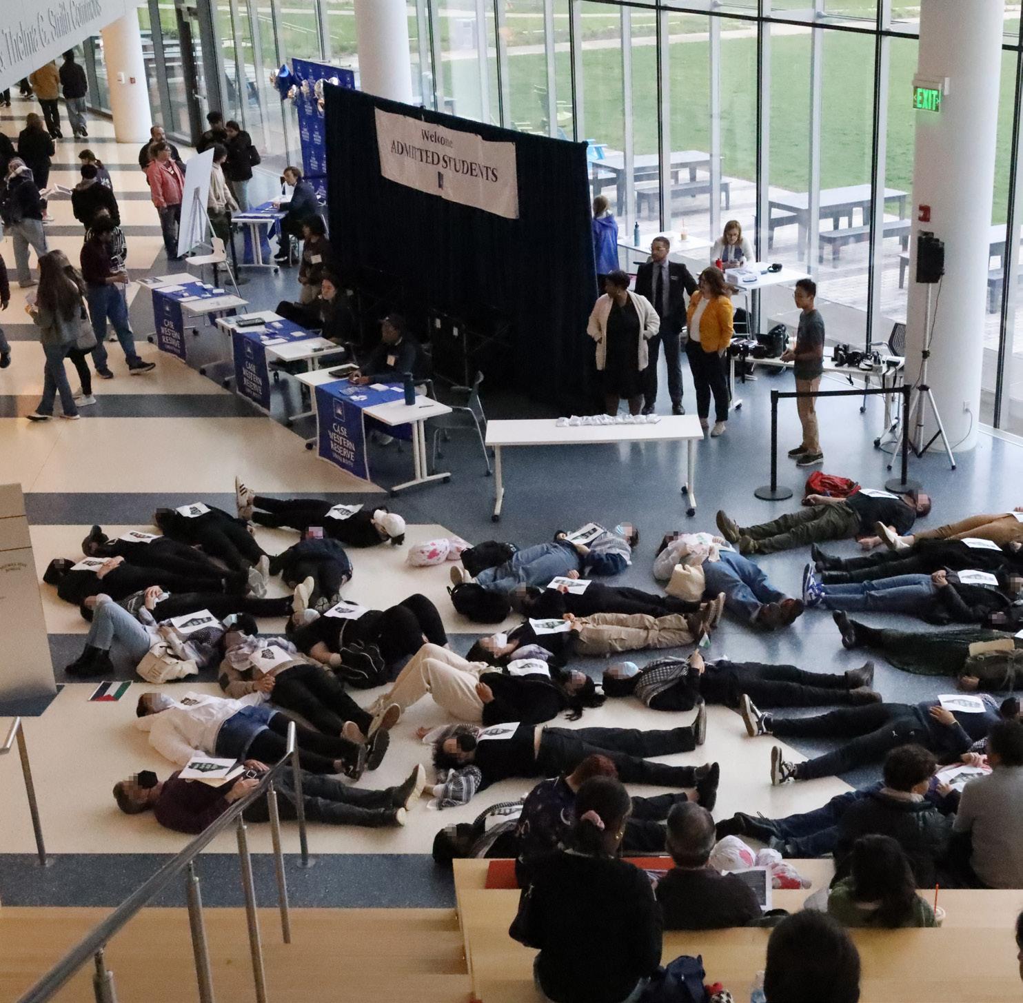 families stared at the scene, the “die-in” protestors disrupted the Open House tours and caused new lines to be redirected into the space behind the large stairs. A group of students also held a banner from the second floor of Tink that proclaimed in bold letters, “Free Palestine”