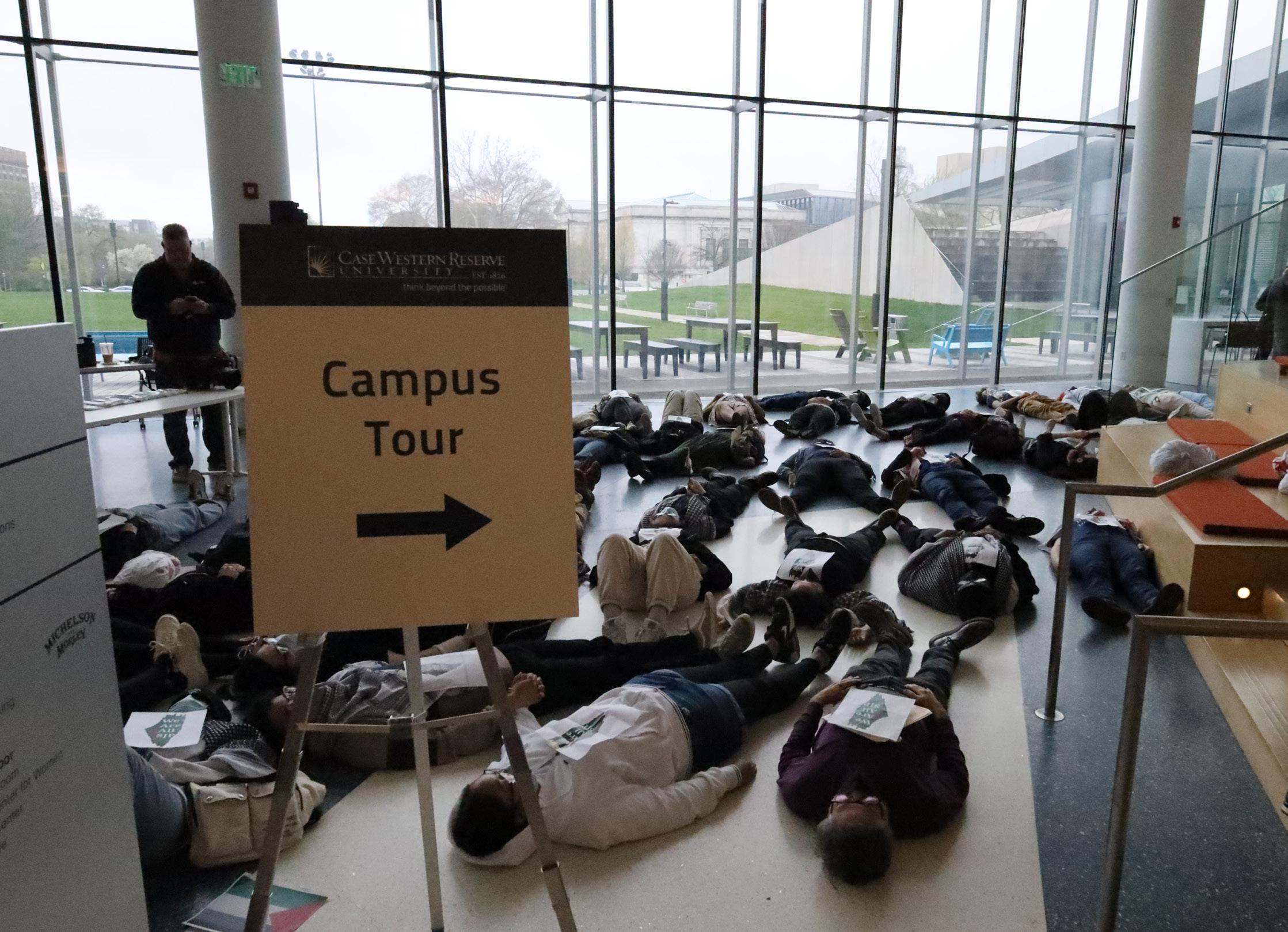 Dozens of Case Western Reserve University students and faculty staged a “die-in” protest in Tinkham Veale University Center on April 19 during CWRU’s Open House/Admitted Students Day. A list of their demands was passed out to onlookers and also included in an open letter to President Eric Kaler. After bringing their protest to Adelbert Hall, where the outside doors were locked and they were unable to reach Kaler, they instead delivered the letter to Interim Vice President for Student Affairs Peter Whiting outside of the building.