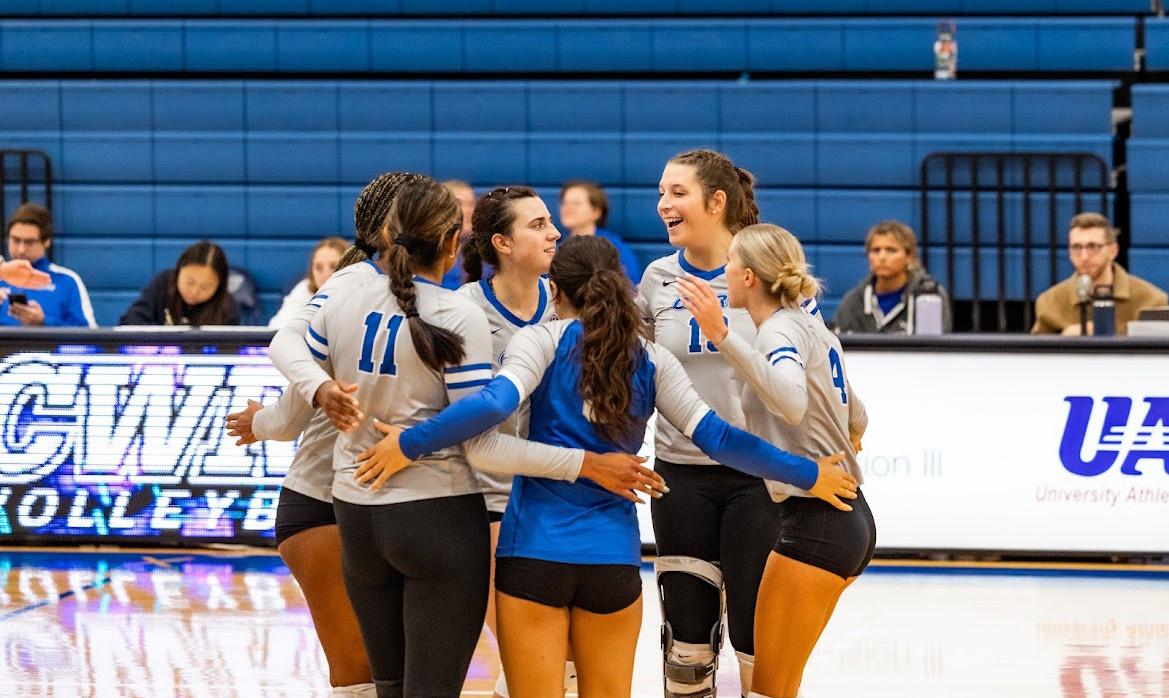 The CWRU volleyball team celebrates after finishing 8-0 at the CWRU Quad, the highest season start since 2016. Courtesy of Myroslava Photography