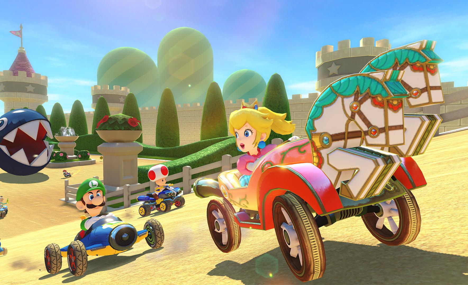DLC, including the grass shortcuts, Chain Chomps, giant Piranha Plant and Monty Moles. However, Nintendo made a monumental change to the new Peach Gardens by forcing players to drive through the track backward on the third lap. The track’s alteration has been received positively by most fans. The calm music sets a nice tone for the track, and the bright visuals are a pleasant sight. Peach Gardens is certainly a welcome addition to wave three of the DLC.