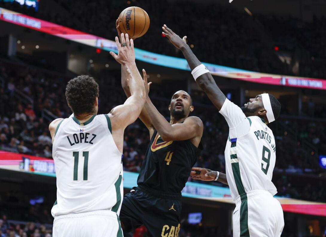 Milwaukee Bucks centers Brook Lopez and Bobby Portis attempt to block Cleveland Cavaliers center Evan Mobley Courtesy of Ron Schwane/Associated Press