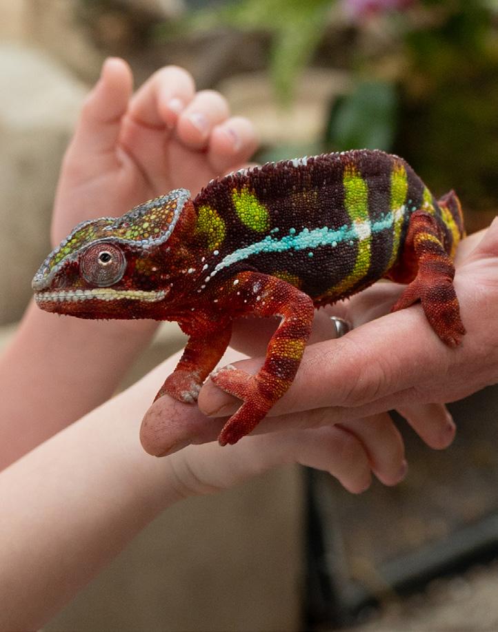 Despite the event, the animals that inhabit the gardens year-round continue to serve as the center of attention for garden goers. Matt Edwards, an animal care specialist, holds Gene Simmons, a red and green chameleon named after a member in the metal band KISS, for his white lips and long tongue. Edwards points to a bird with an orange coat and explains to a visitor that it is a red bishop weaver. The gardens are home to orange-cheeked waxbills, yellow bishop weavers, a blue-billed teal and the elusive pintailed whydah. Edwards describes the whydah as a “white and black bird with a tail about eight inches long.” He adds, “There’s only one male here.”