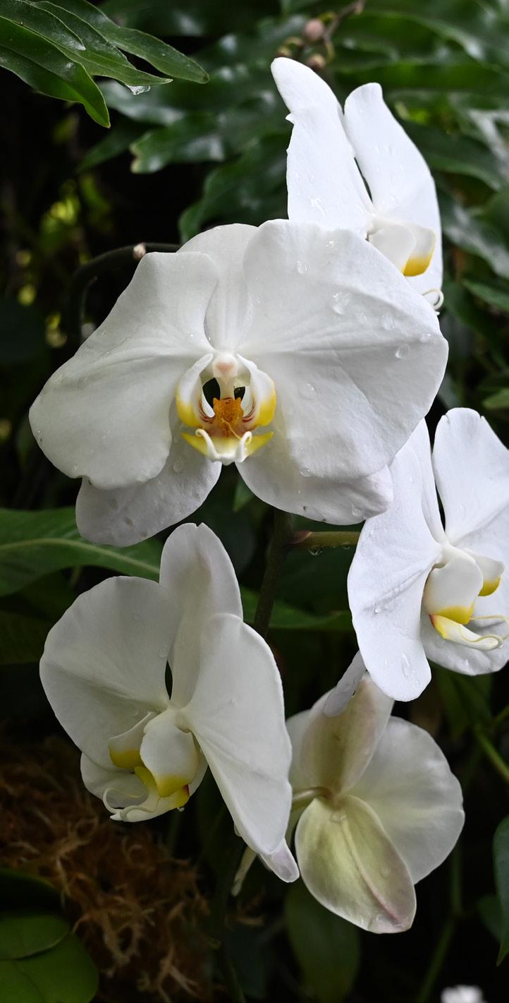 Walking through the air lock to exit the animal exhibit, the air shifts from dry to tropical. Stepping into the forest atrium, purple and white orchids reflect off puddles, and the trees cast