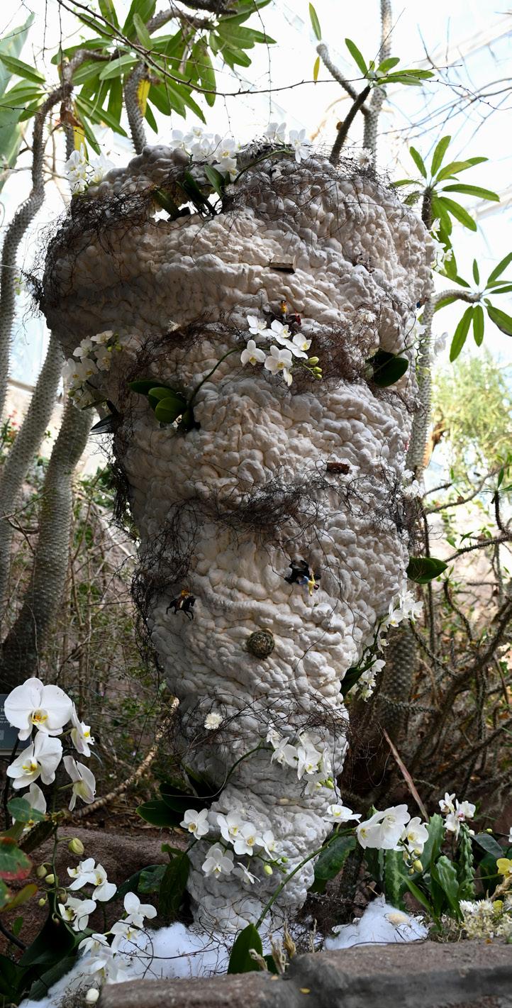 rock like pennant flags. In one corner, a sculpture of a tornado emerges from the earth, composed of white folds that resemble marshmallows. Further inspection shows a cowboy falling off his horse, a cactus sprouting and, of course, more orchids to remind the visitors of the theme.