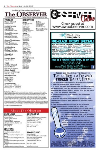 editors make policy and content decisions. The mission of the Observer is two-fold: to serve Central Washington University as a newspaper and to provide training for students who are seeking a career in journalism. The Observer seeks to provide complete, accurate, dependable information to the campus and community; to provide a public forum for the free debate of issues, ideas and problems facing the community at large, and to be the best source for information, education and entertainment news. As a training program, the Observer is the practical application of the theories and principles of journalism. It teaches students to analyze and communicate information that is vital to the decision making of the community at large. It provides a forum for students to learn the ethics, values, and skills needed to succeed in their chosen career. If you have questions call (509) 963-1073 or e-mail us at cwuobserver@gmail.com